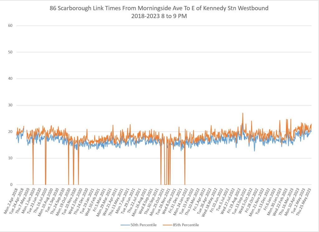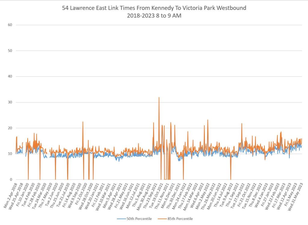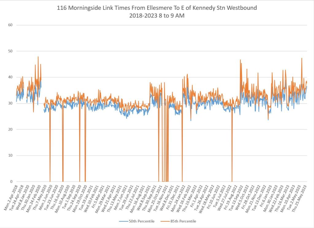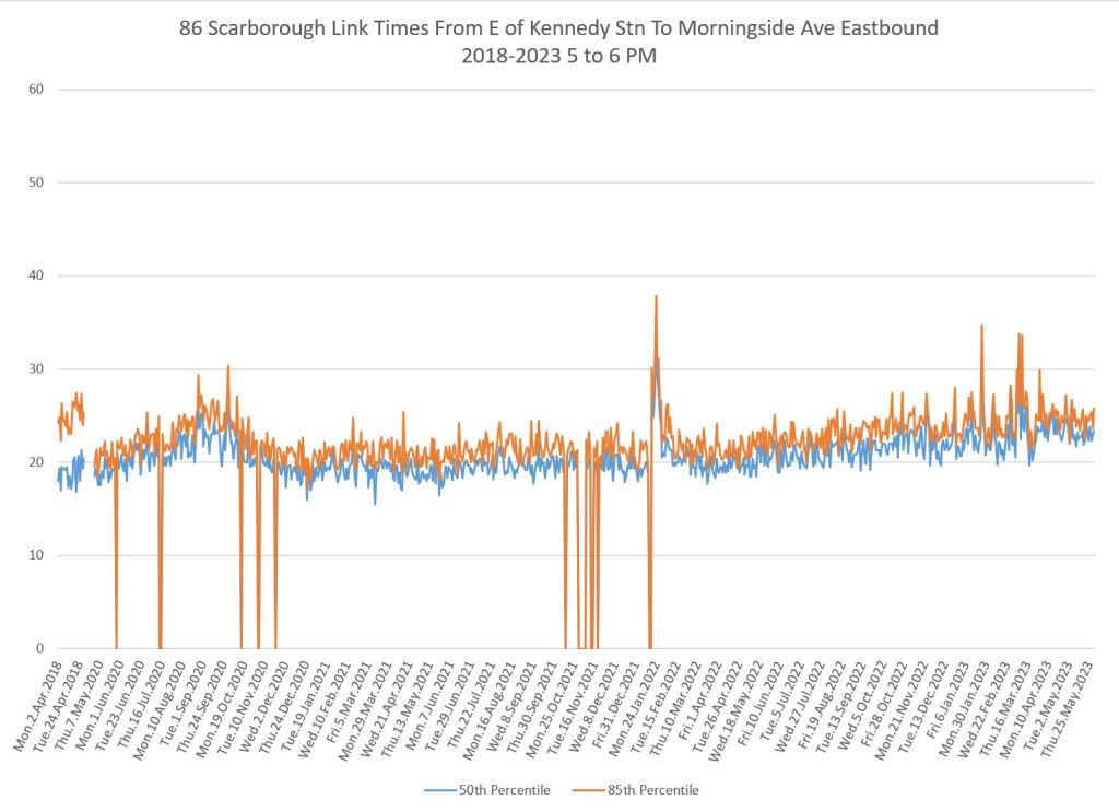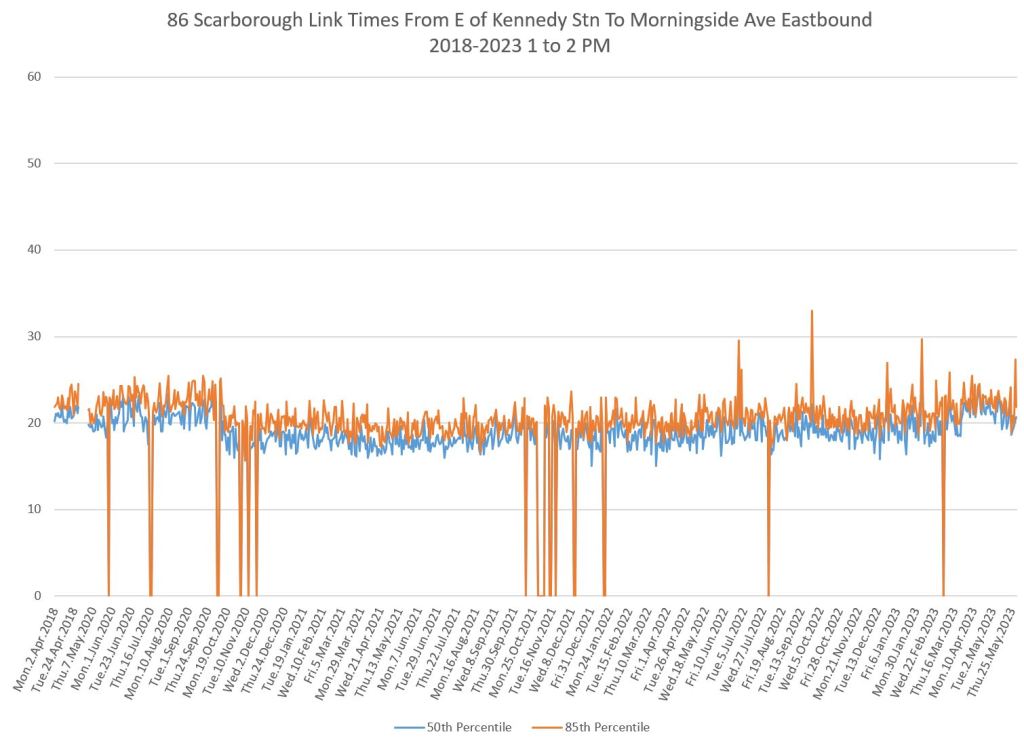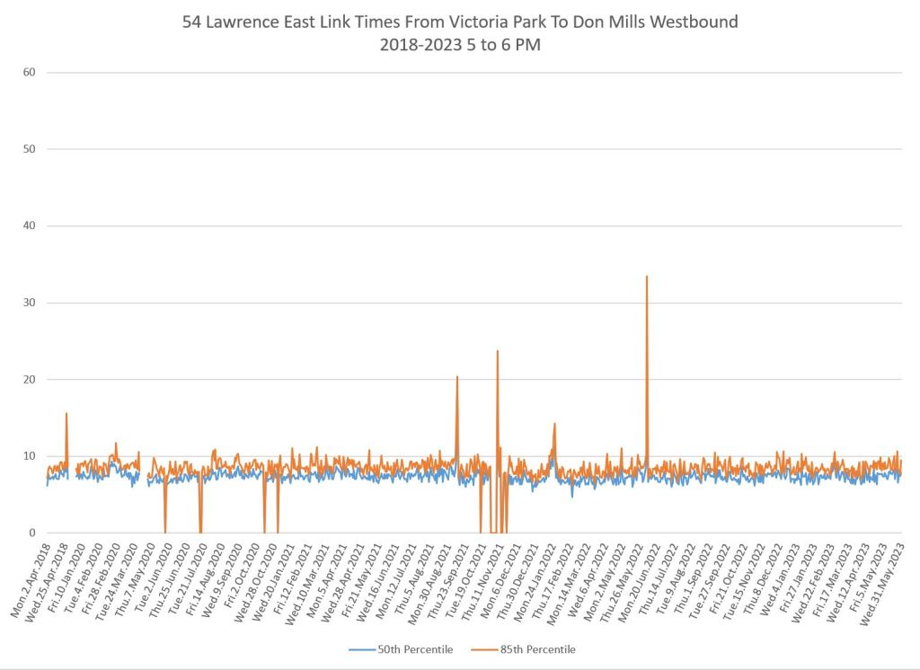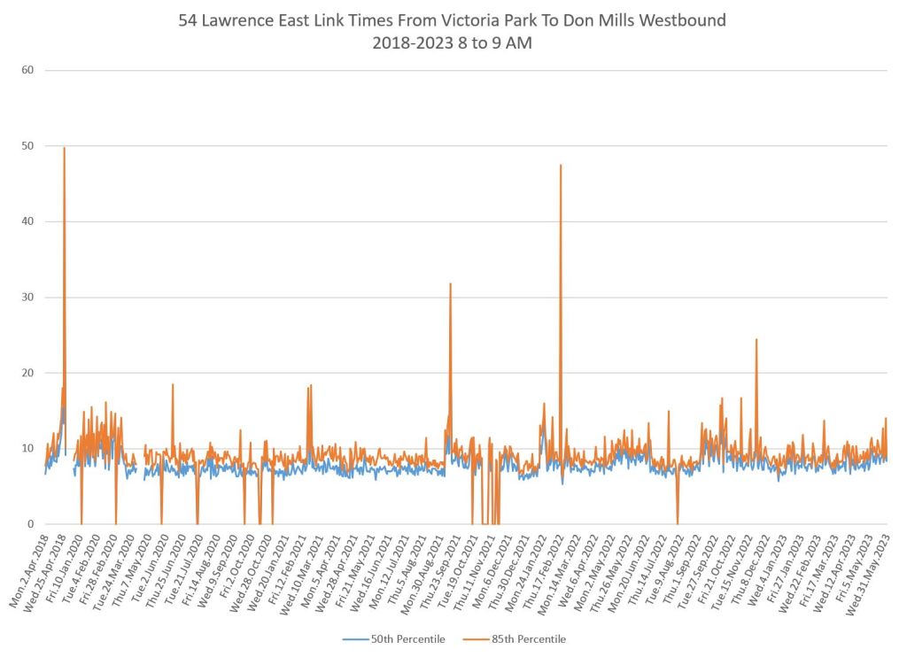 From Victoria Park west to Don Mills, the travel times are also quite consistent. Westbound in the AM peak shows a pre-covid rise, but this is the only period and direction where that happens.