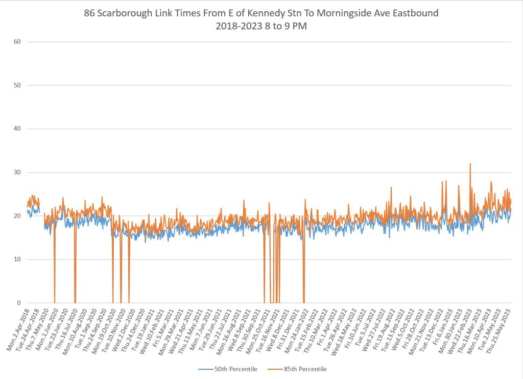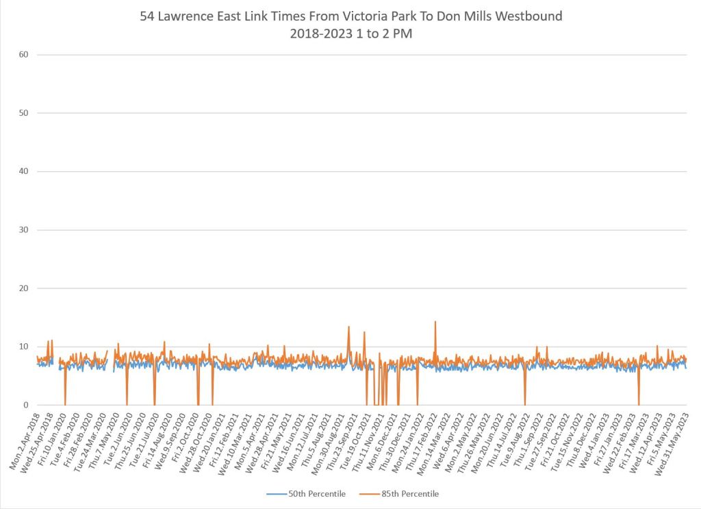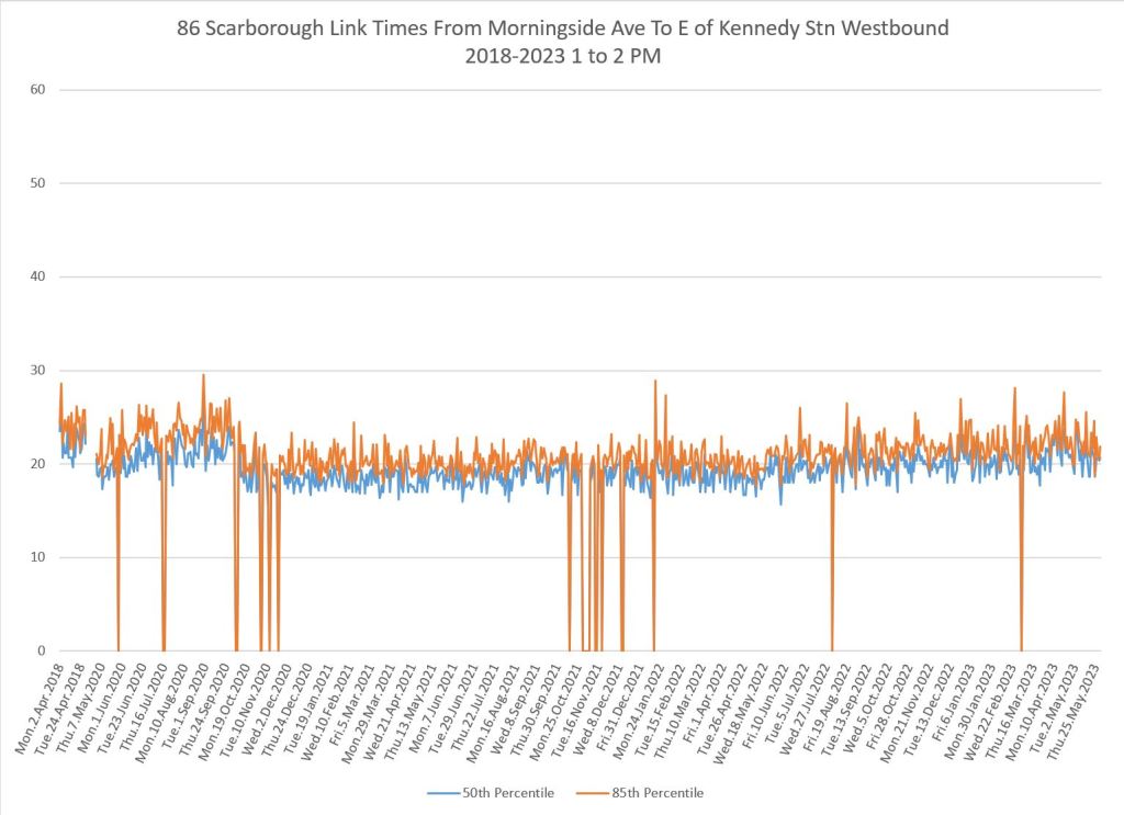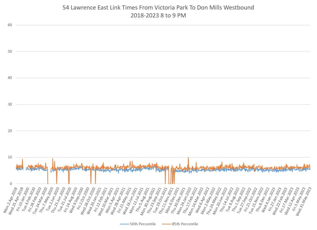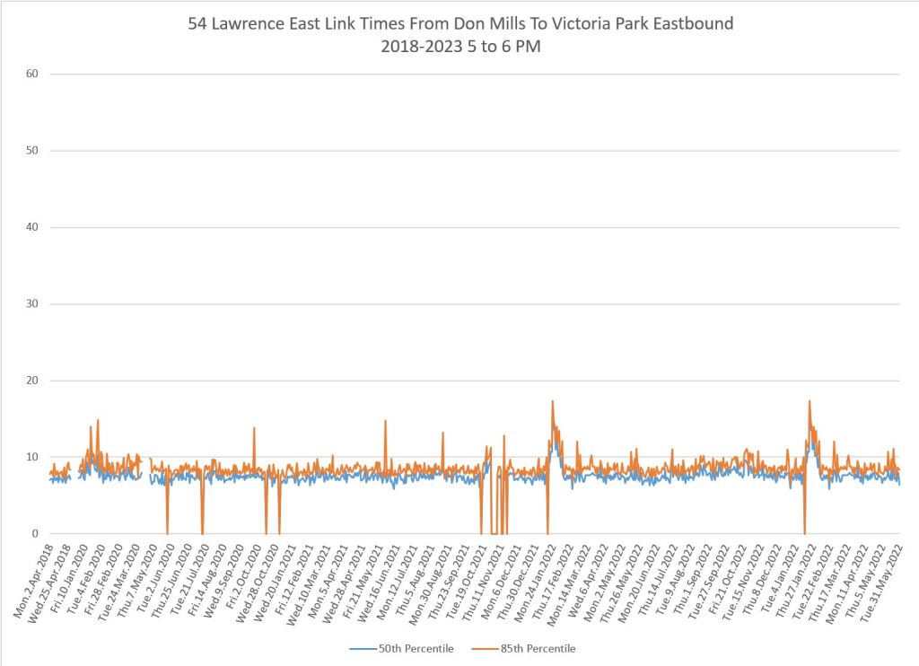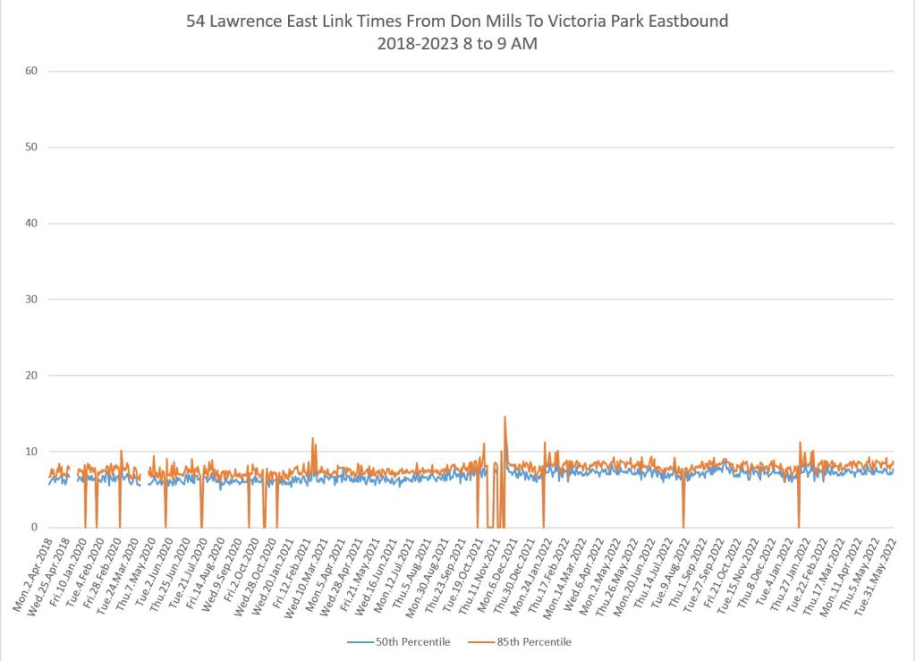 From Victoria Park west to Don Mills, the travel times are also quite consistent. Westbound in the AM peak shows a pre-covid rise, but this is the only period and direction where that happens.