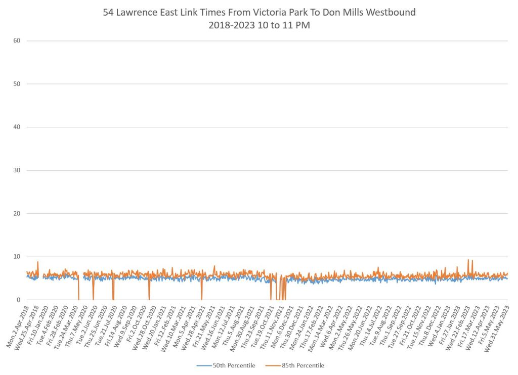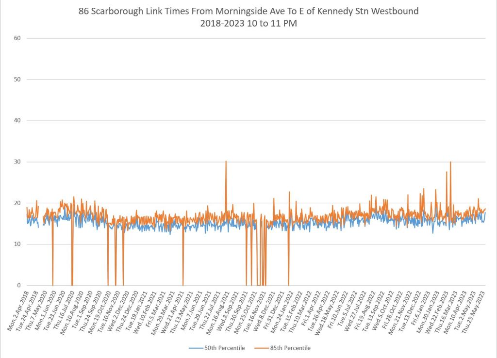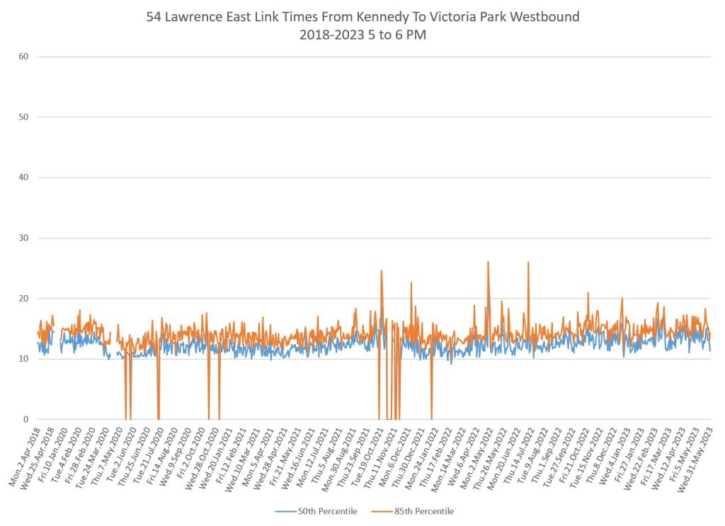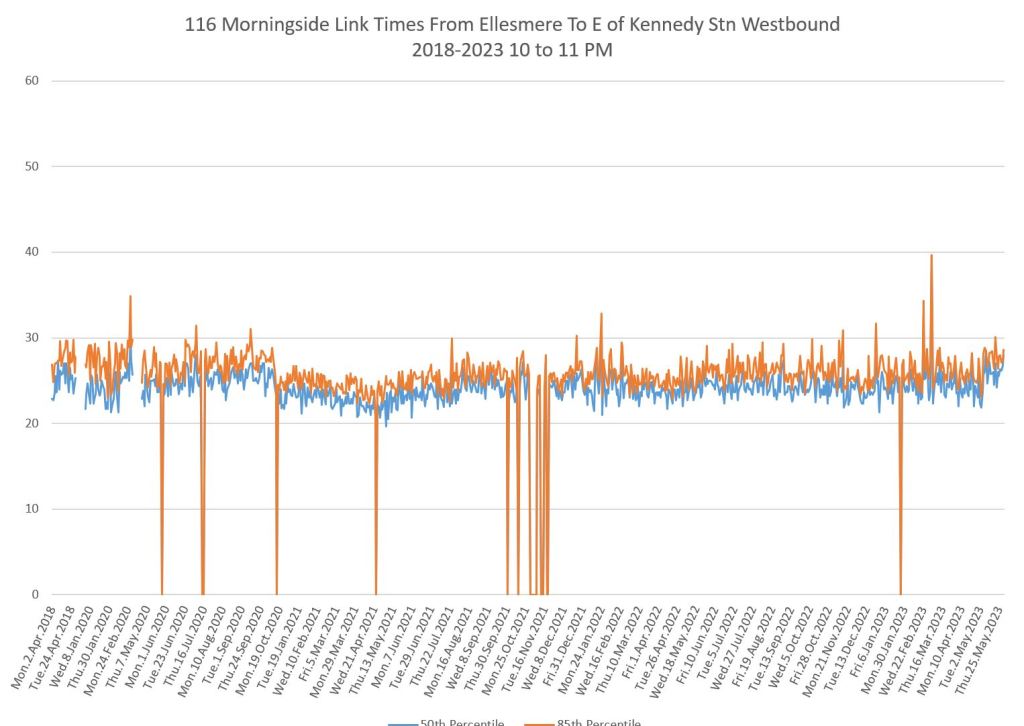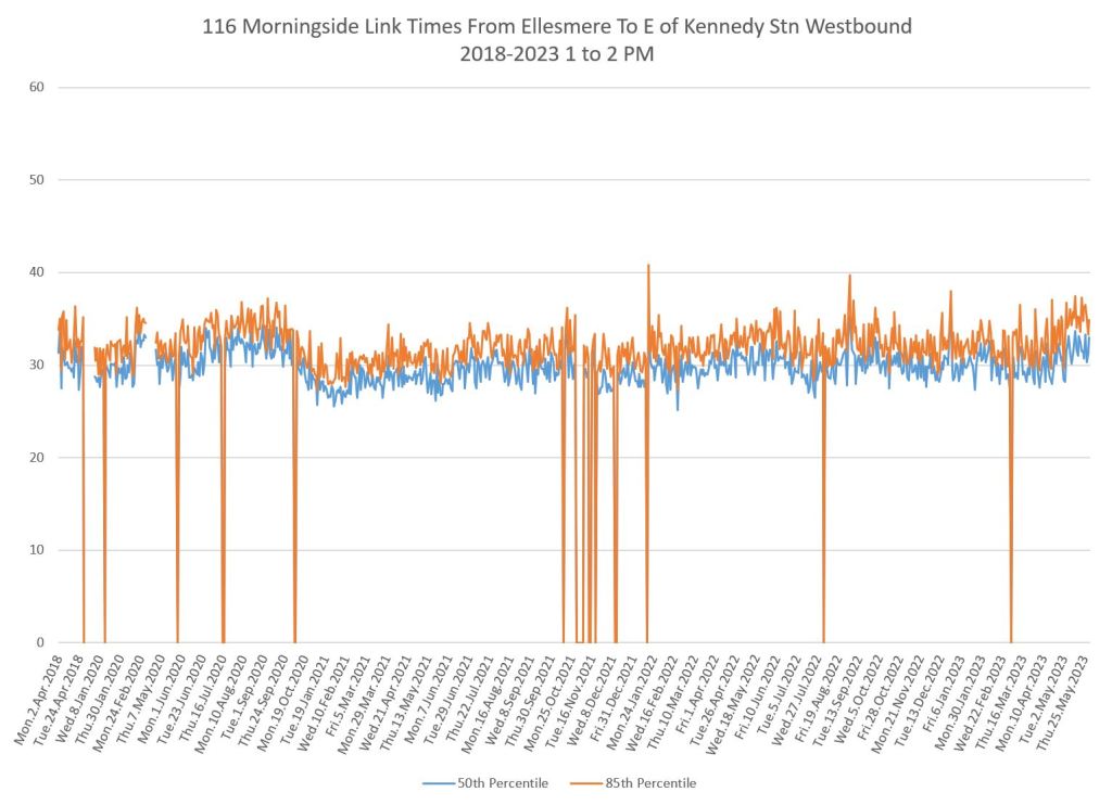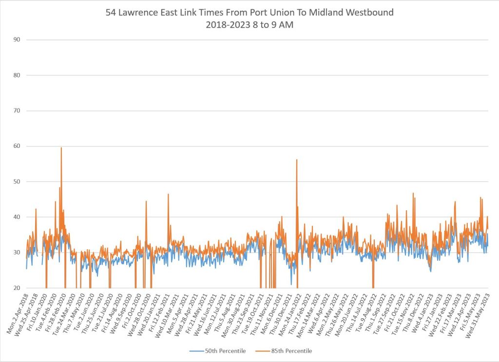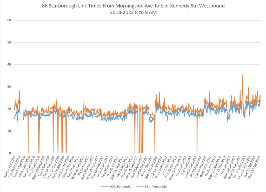 From Victoria Park west to Don Mills, the travel times are also quite consistent. Westbound in the AM peak shows a pre-covid rise, but this is the only period and direction where that happens.