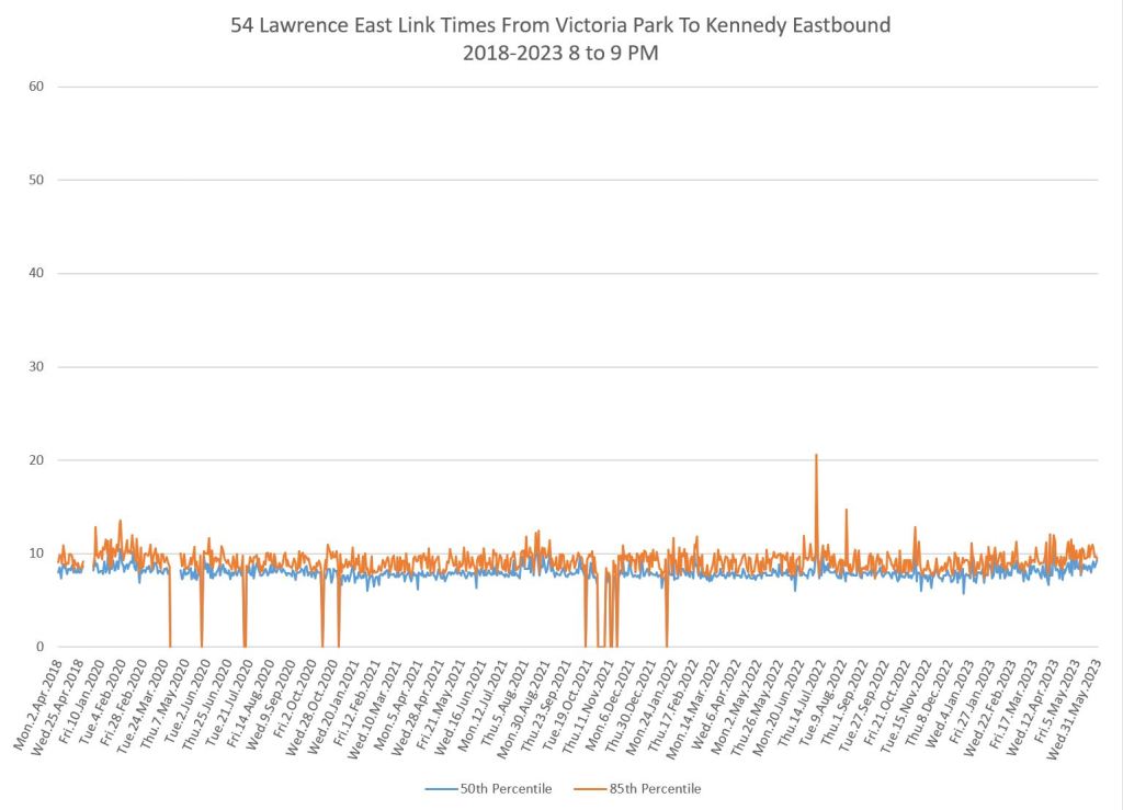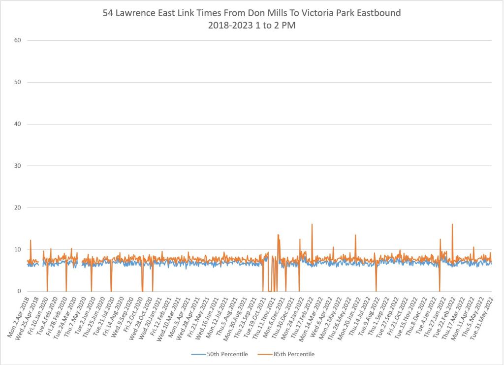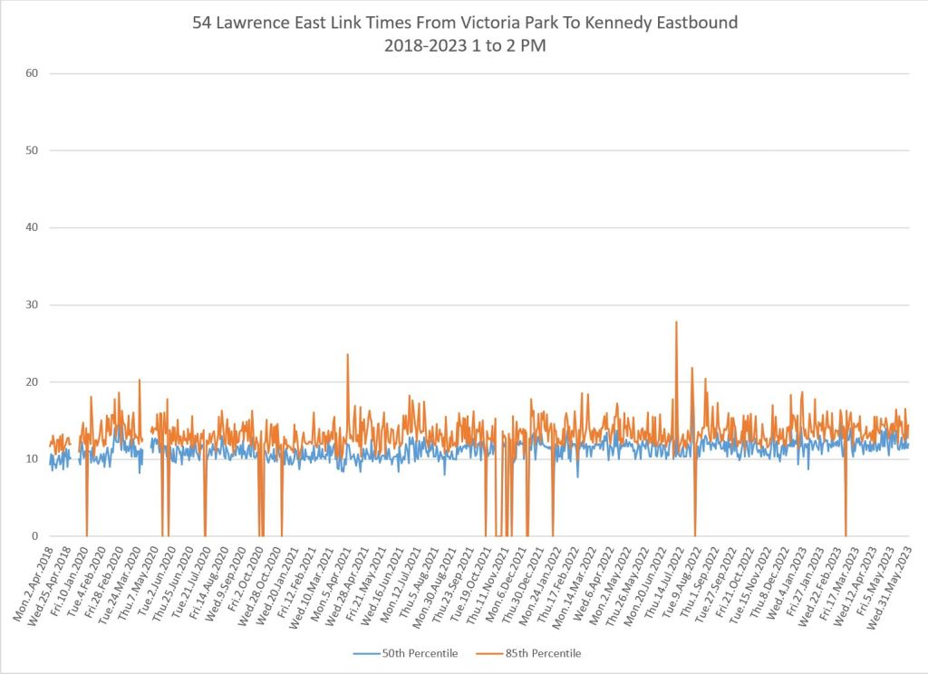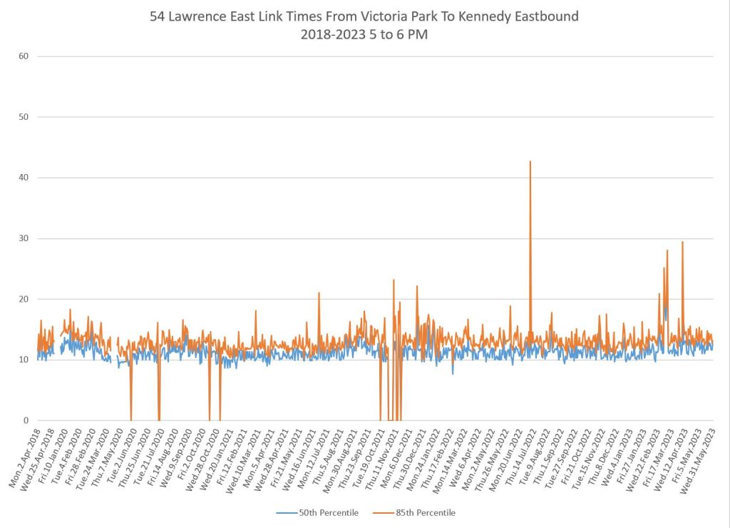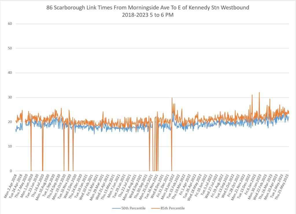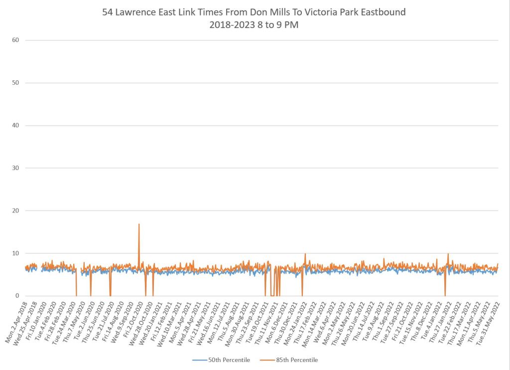From Victoria Park west to Don Mills, the travel times are also quite consistent. Westbound in the AM peak shows a pre-covid rise, but this is the only period and direction where that happens.