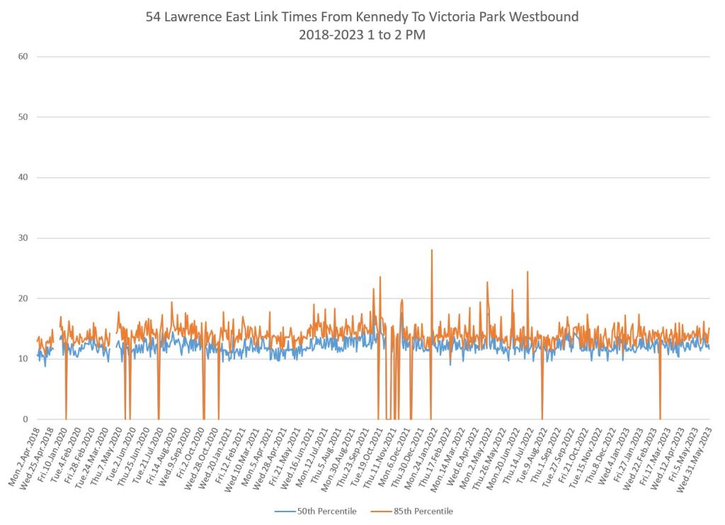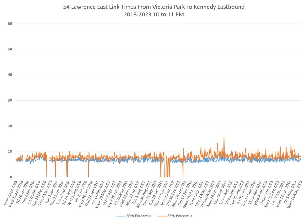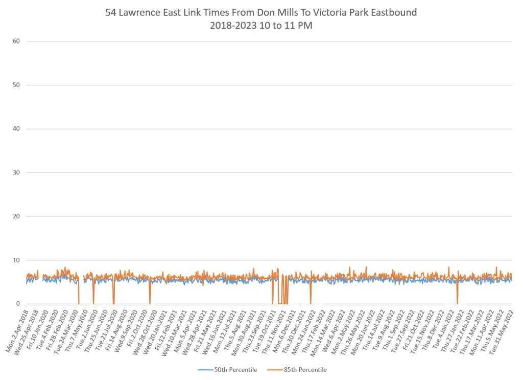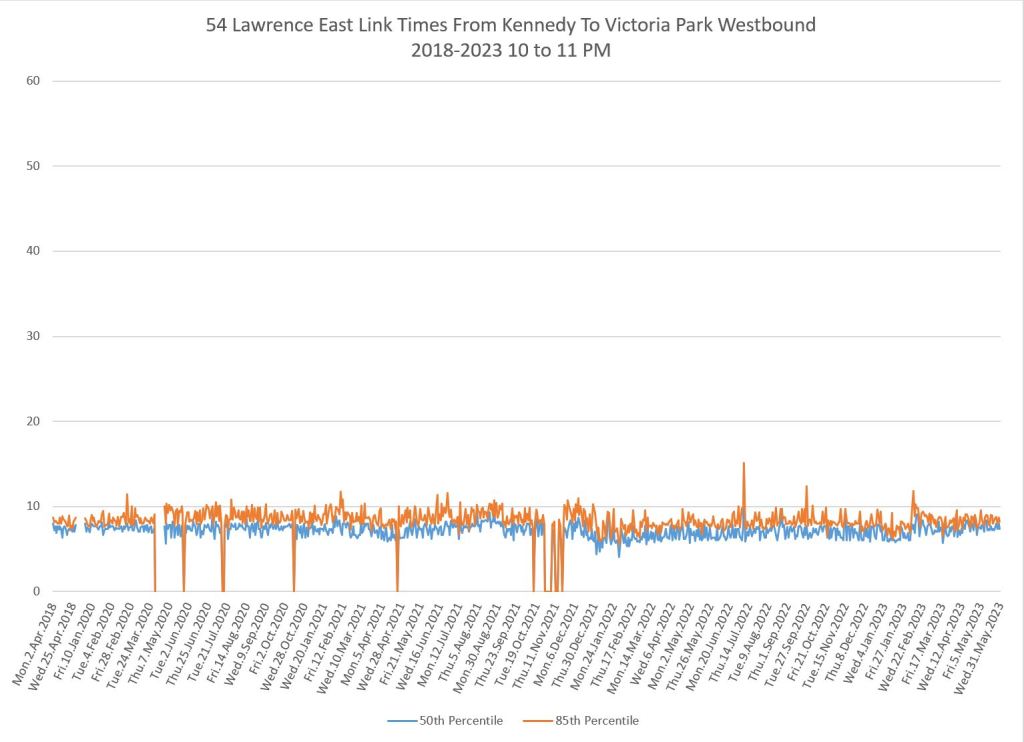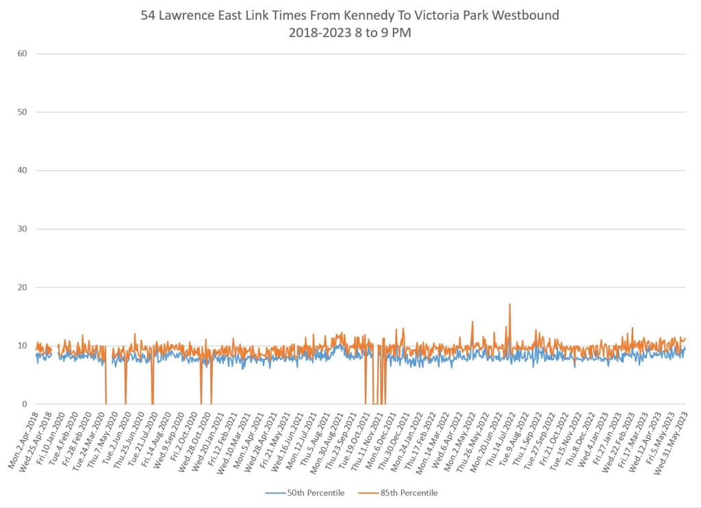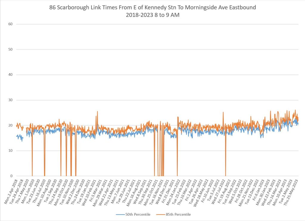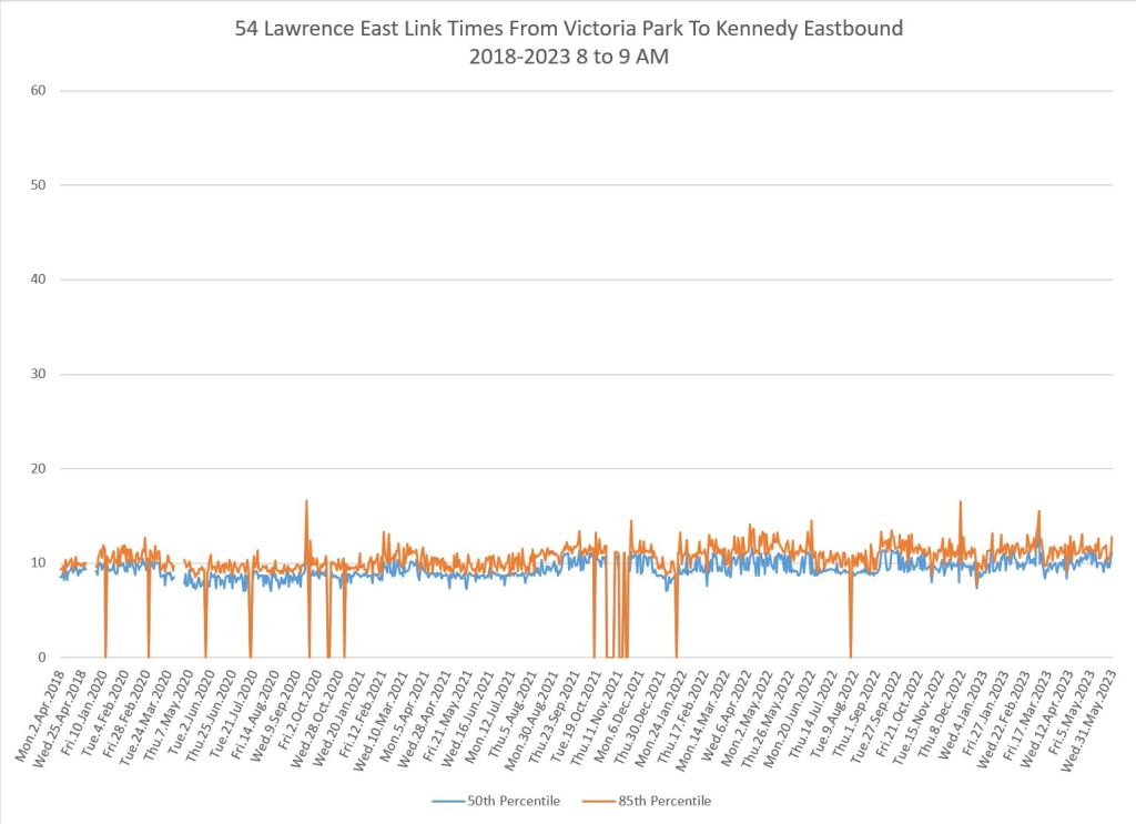 From Victoria Park west to Don Mills, the travel times are also quite consistent. Westbound in the AM peak shows a pre-covid rise, but this is the only period and direction where that happens.