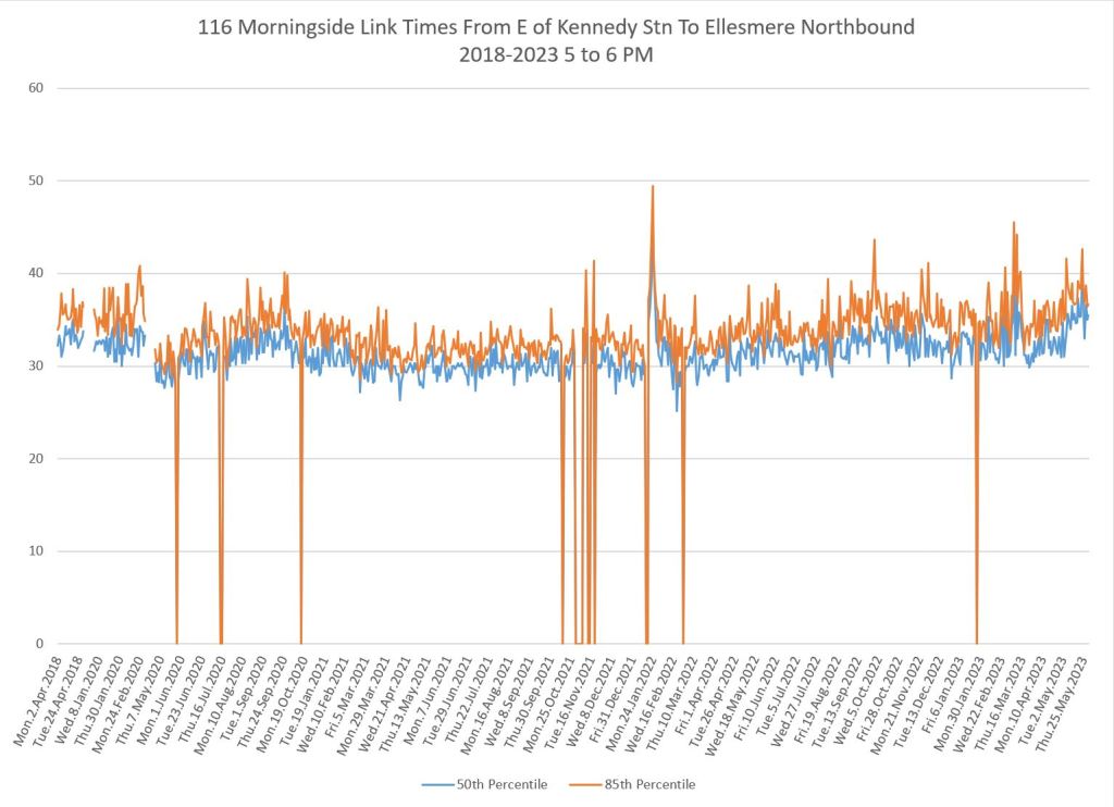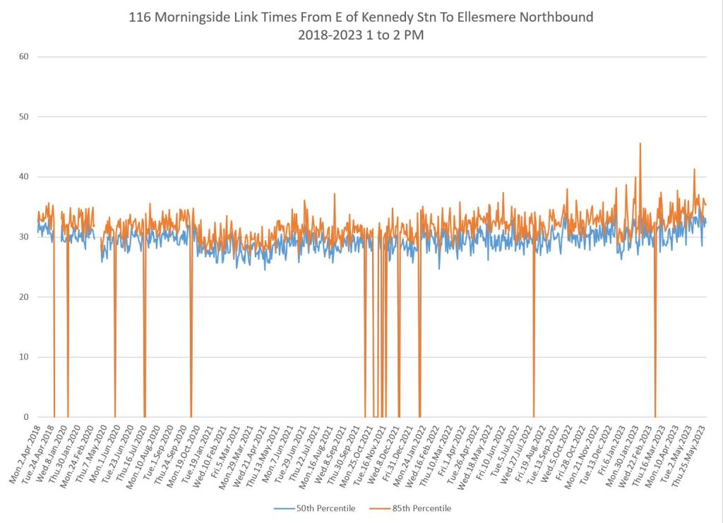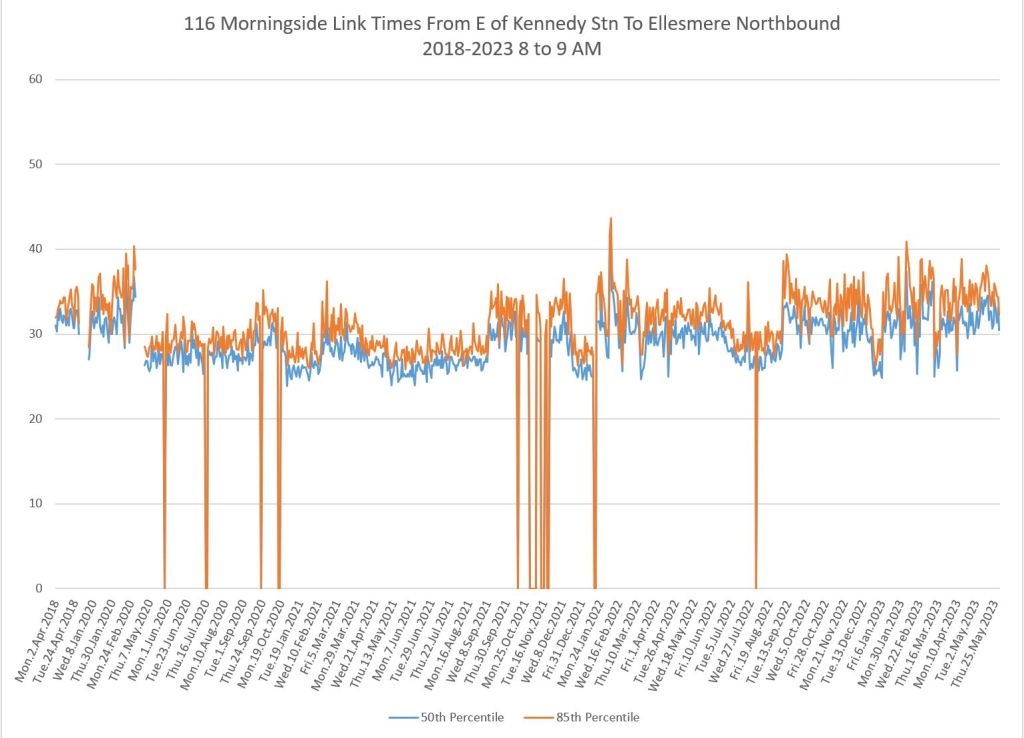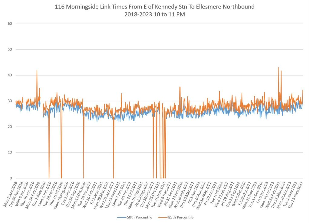 My purpose is to show the drop in travel times in March 2020 co-incident with the pandemic lockdown, and the gradual recovery over the past three years. The minimum times seen in 2020 establish what we would see in the absence of road traffic, not to mention a lower passenger demand, and probably show the best case for improvement with transit priority.