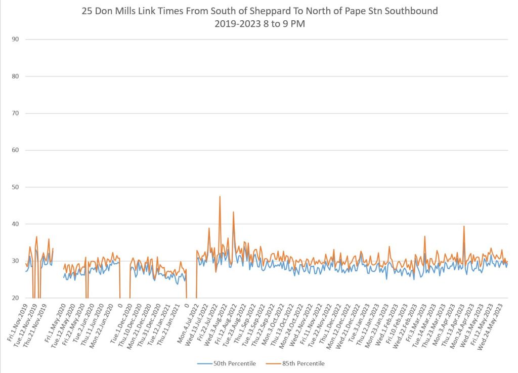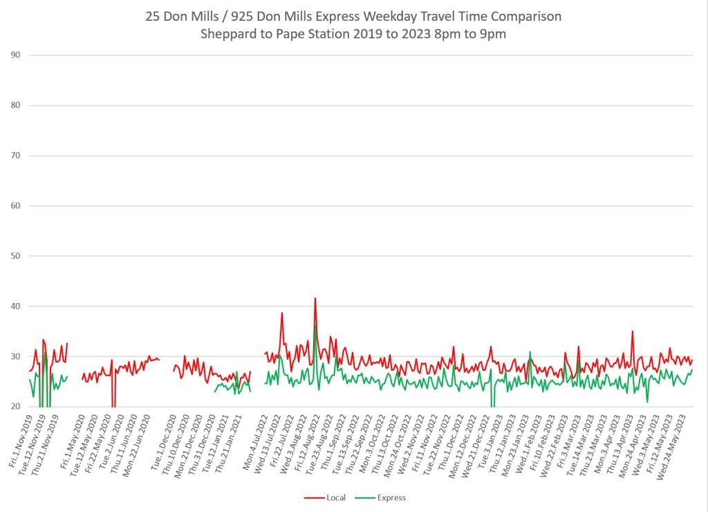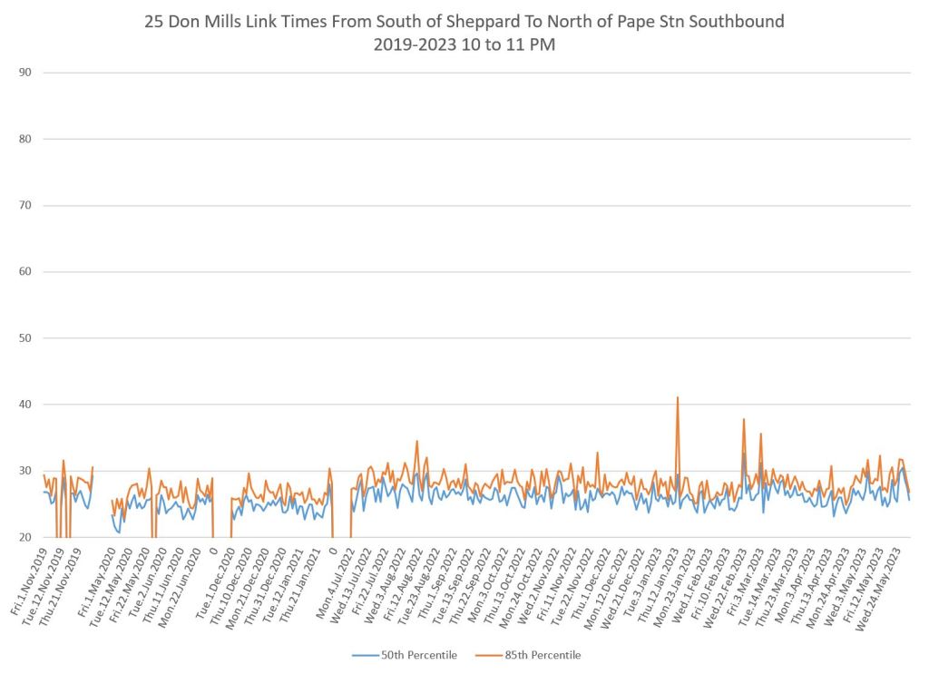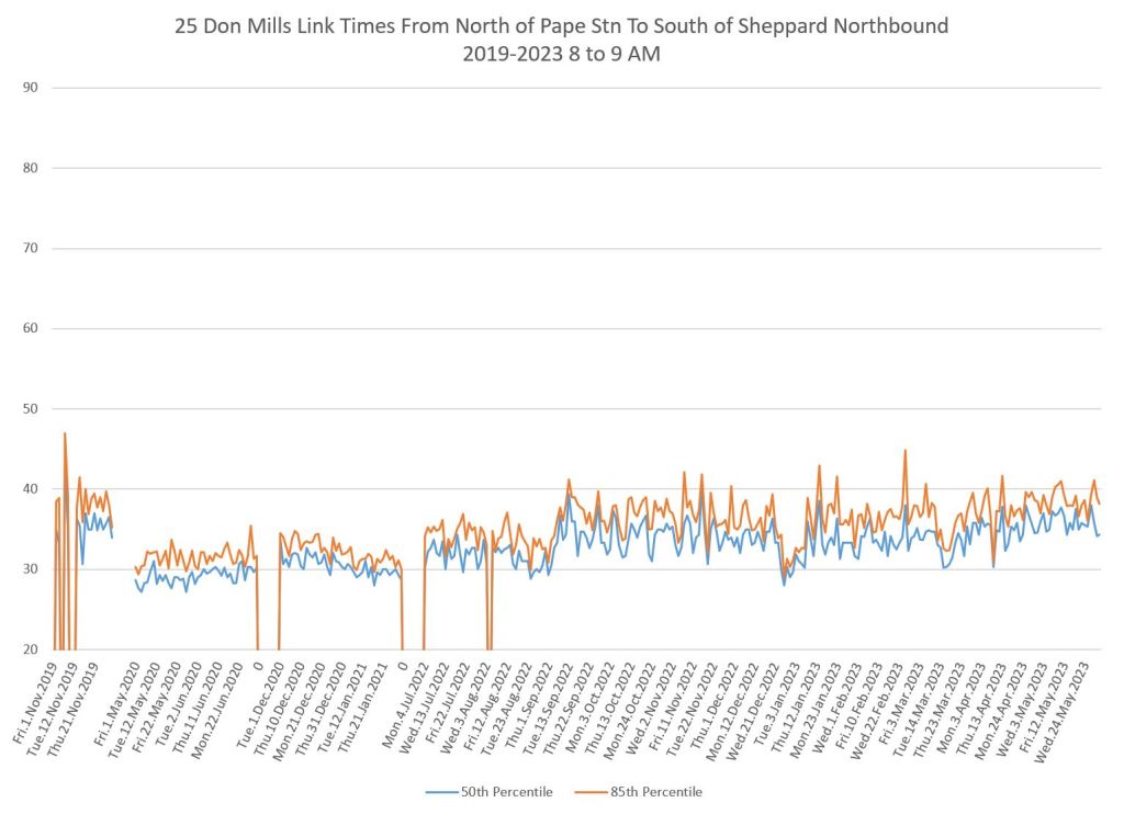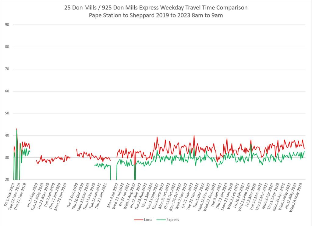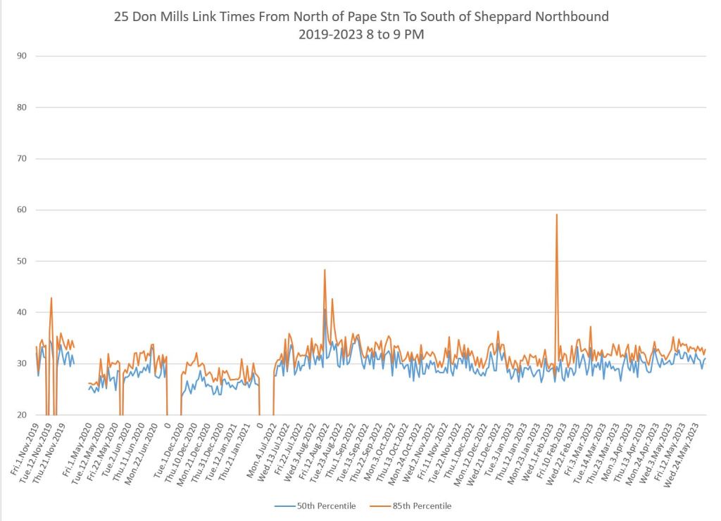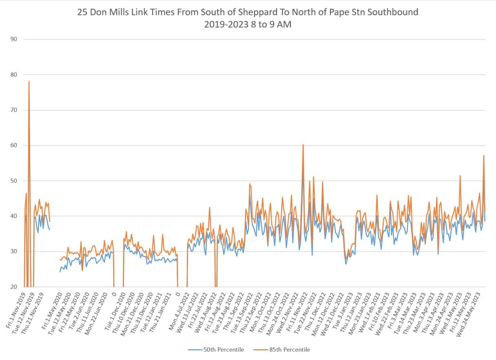 The 25 Don Mills local service shows a drop in travel times in the covid era, but a fairly quick growth back to pre-pandemic levels in some periods.