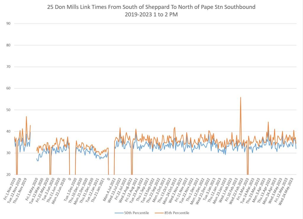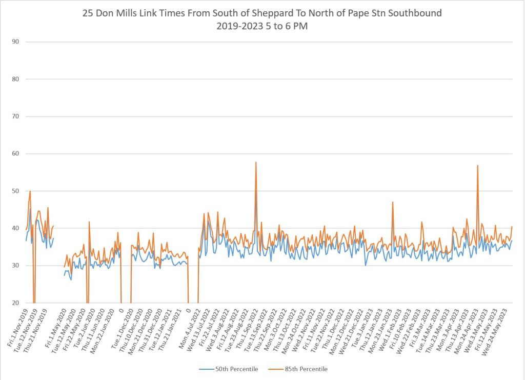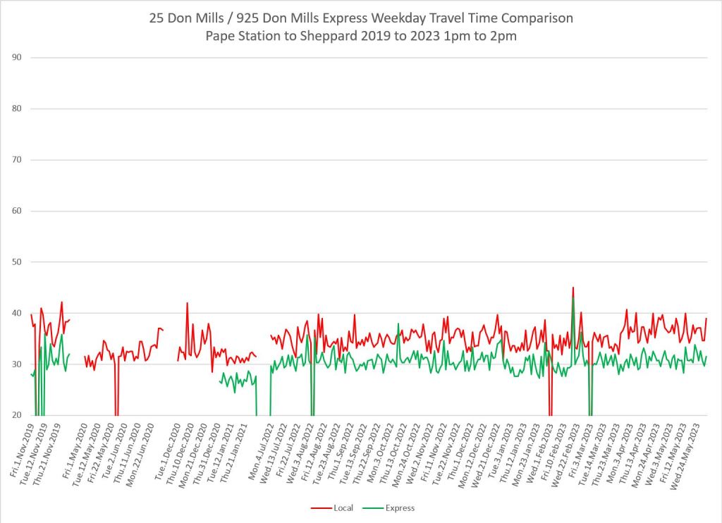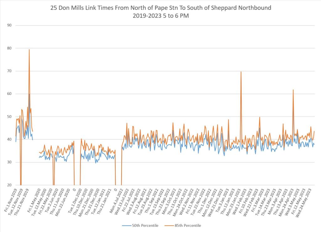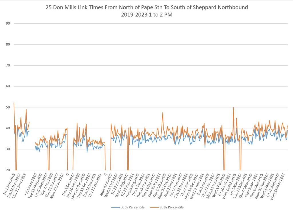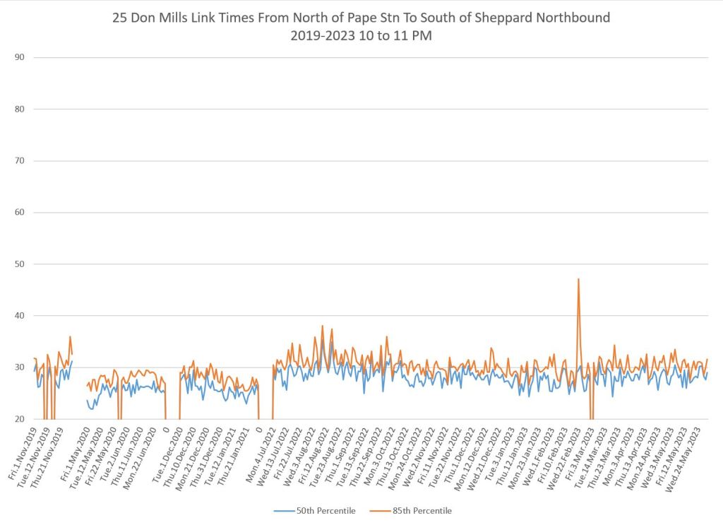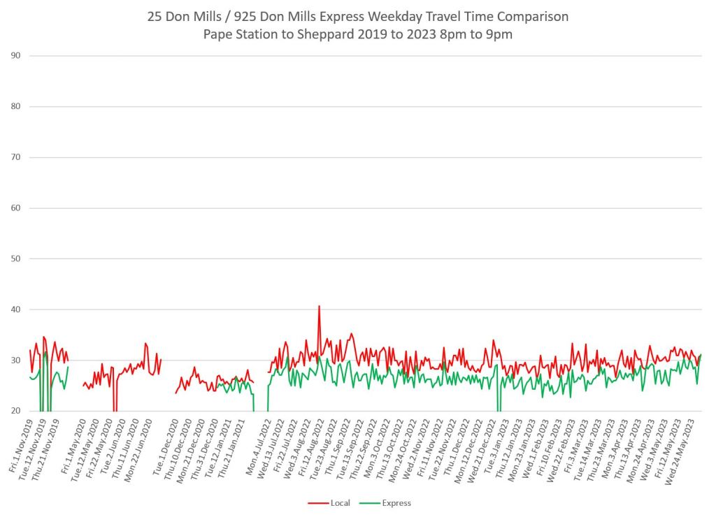 The 25 Don Mills local service shows a drop in travel times in the covid era, but a fairly quick growth back to pre-pandemic levels in some periods.