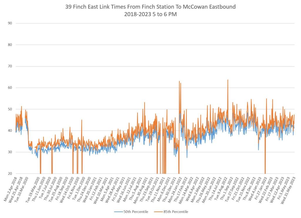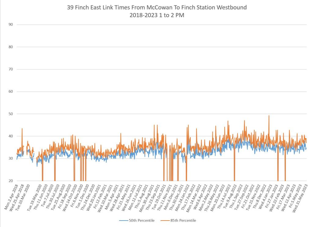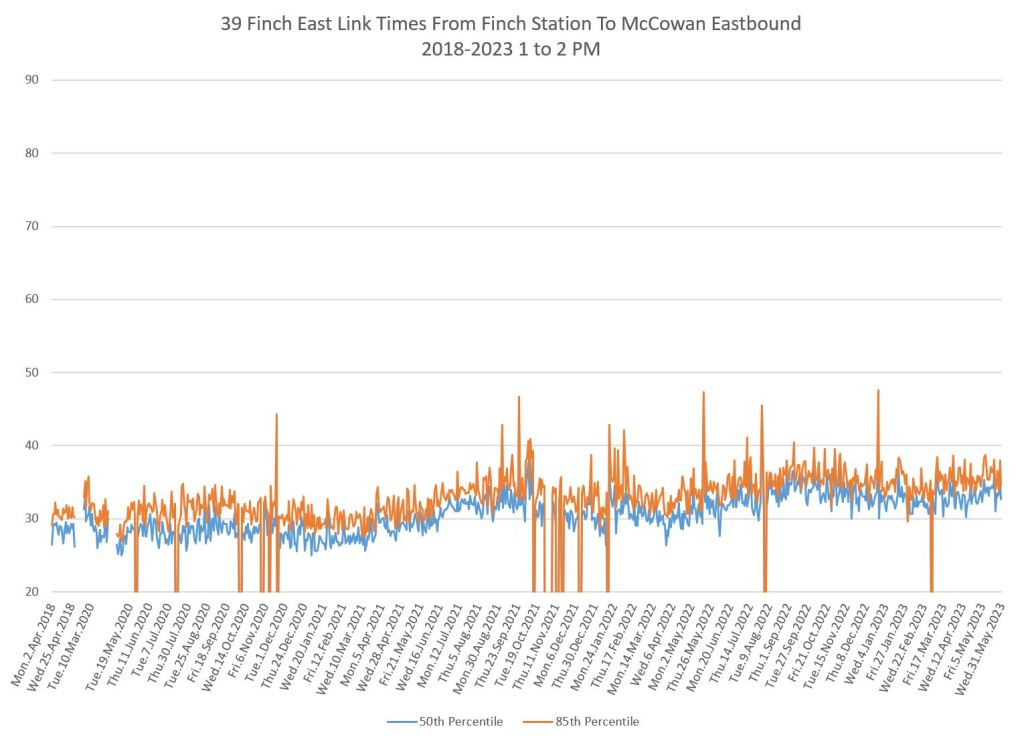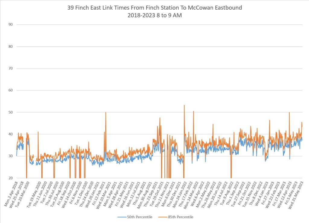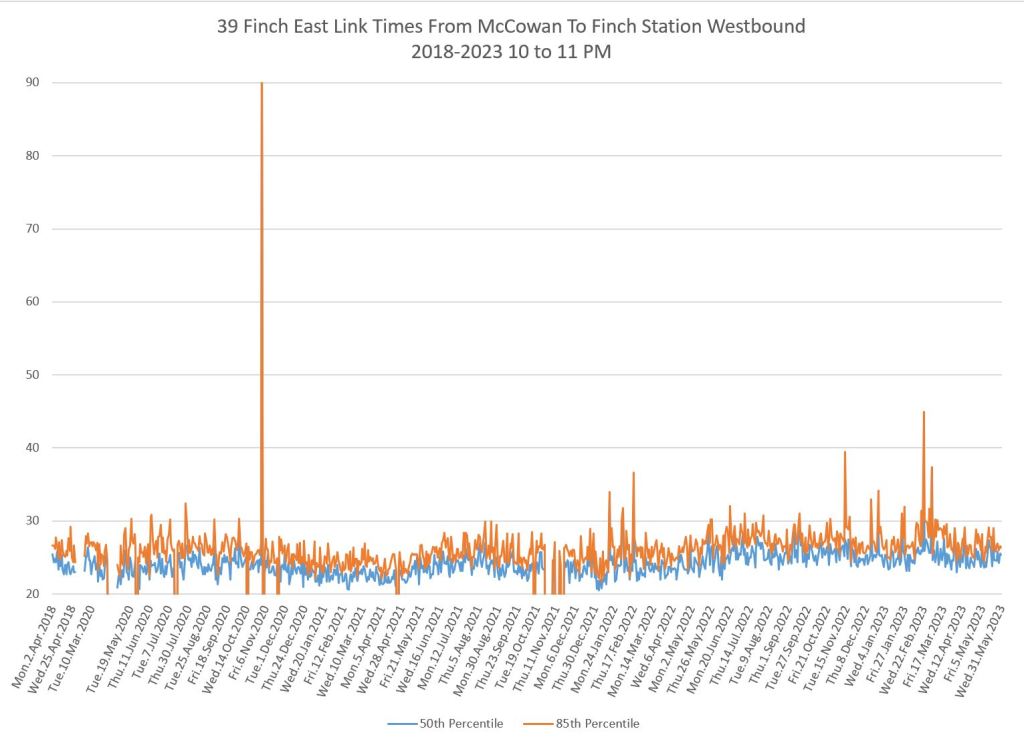 Travel times for the Finch East services are plotted here between Finch Station and McCowan Road, the point where the 939 Finch Express shifts to local operation.