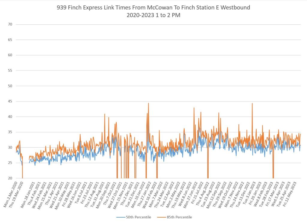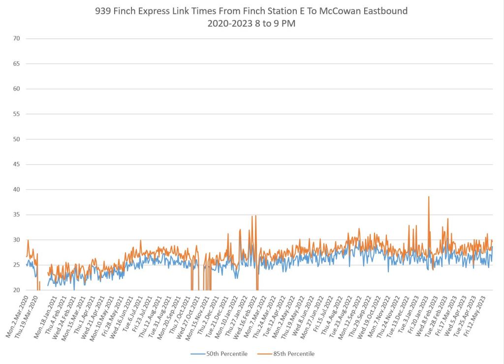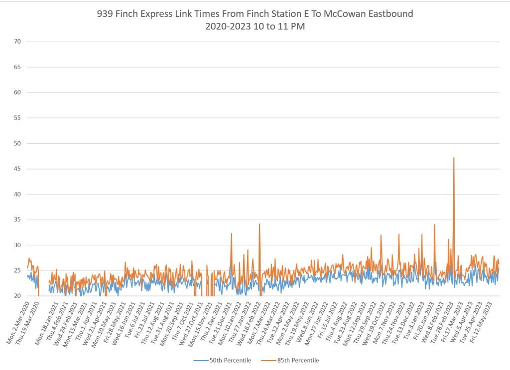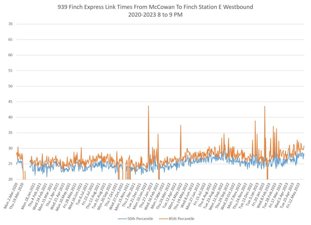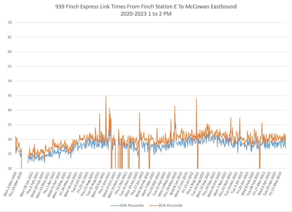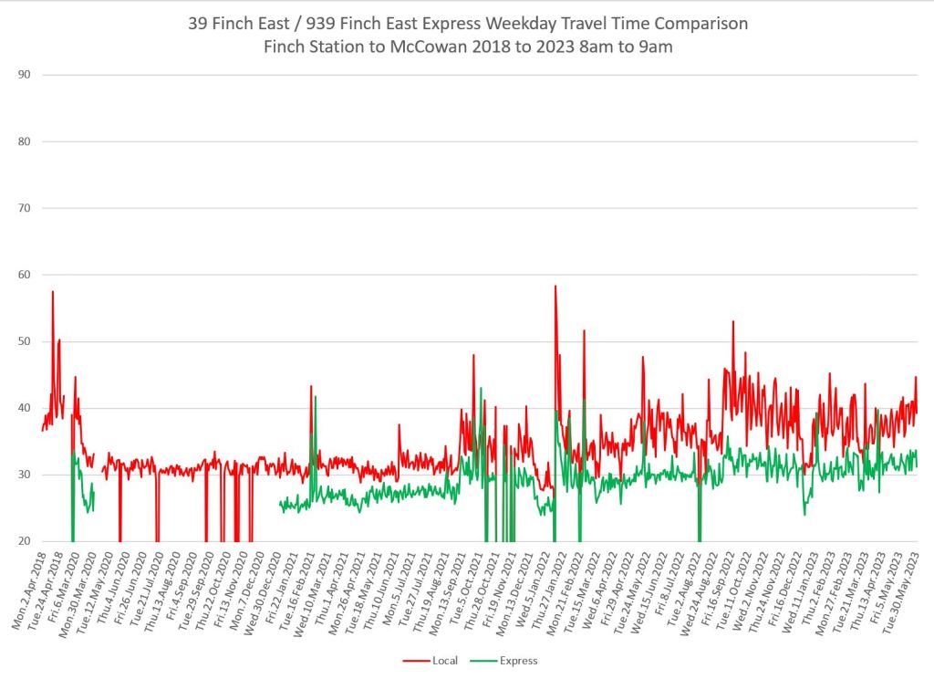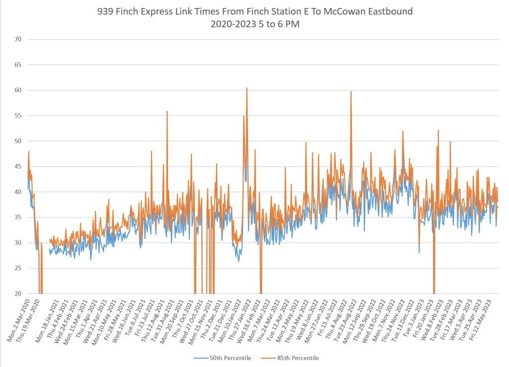 The 939 Finch Express shows a similar pattern in the evolution of travel times from 2020 to 2023 as the local service, and during many periods are at or above pre-pandemic levels.