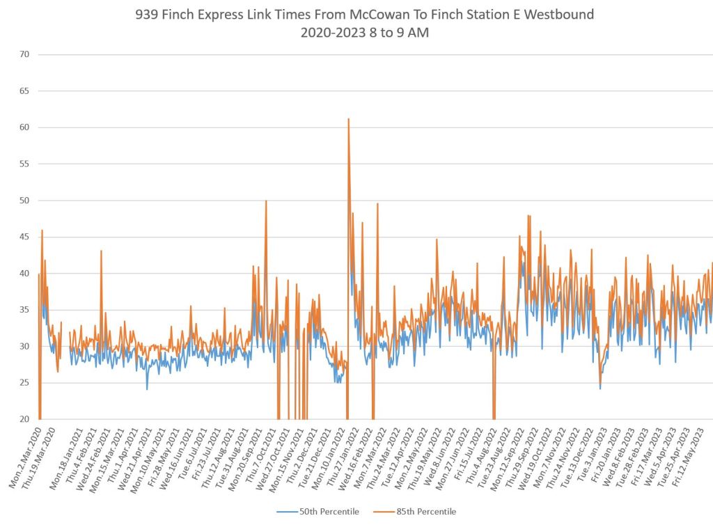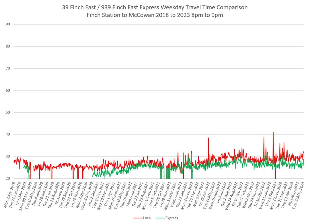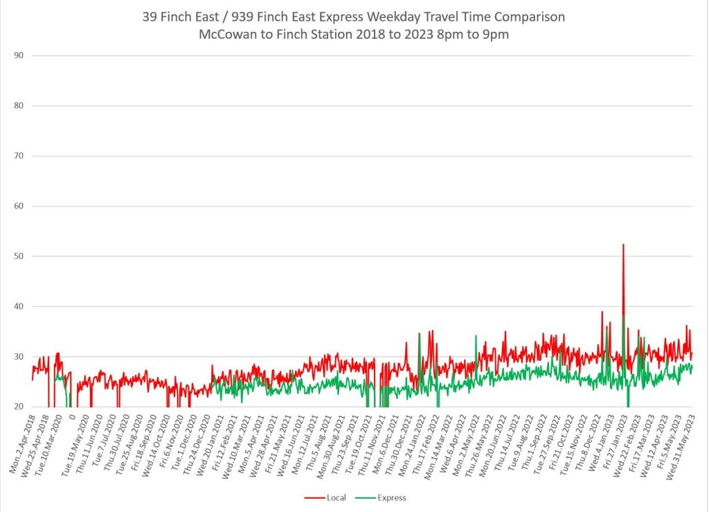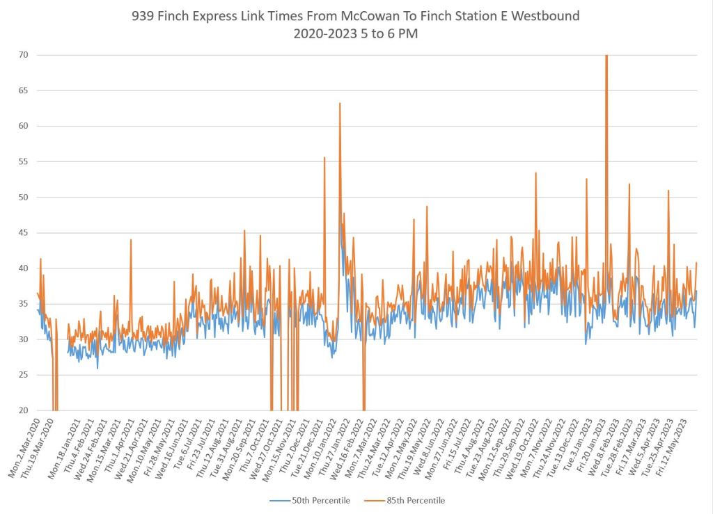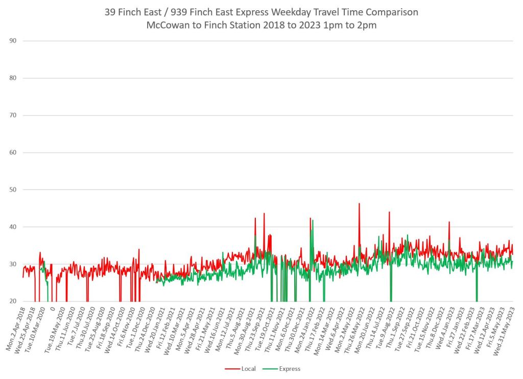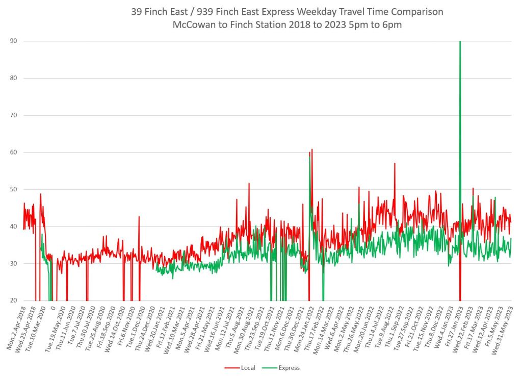 The 939 Finch Express shows a similar pattern in the evolution of travel times from 2020 to 2023 as the local service, and during many periods are at or above pre-pandemic levels.