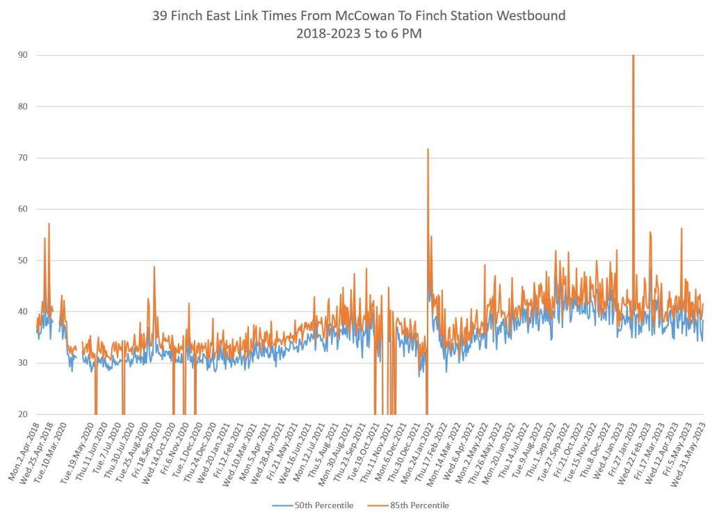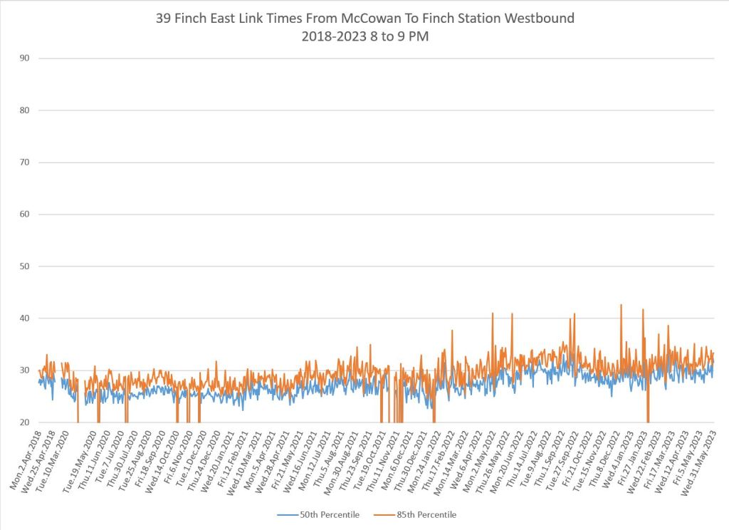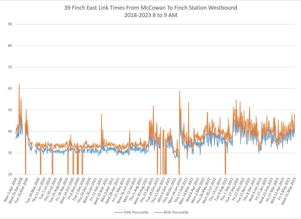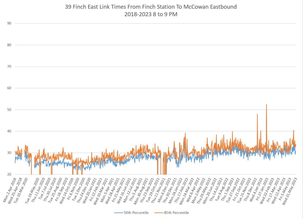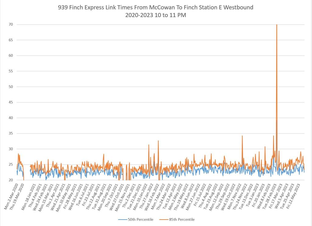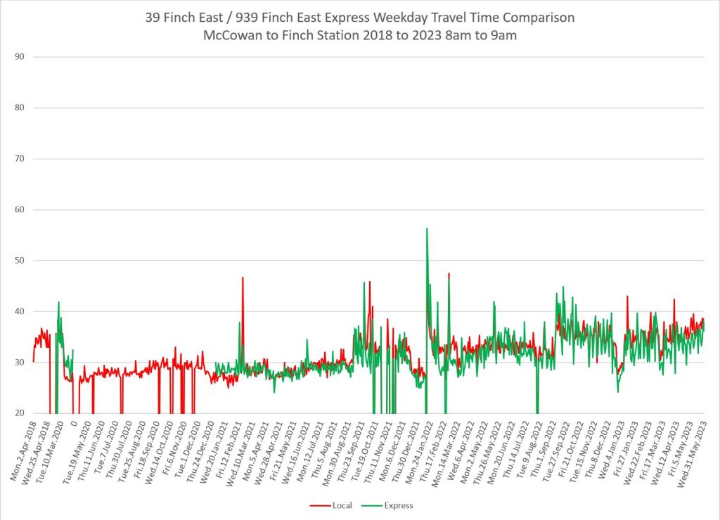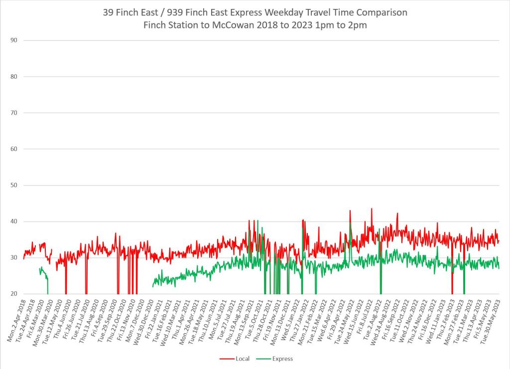 The 939 Finch Express shows a similar pattern in the evolution of travel times from 2020 to 2023 as the local service, and during many periods are at or above pre-pandemic levels.