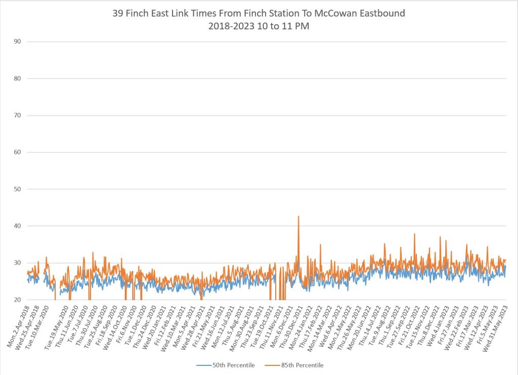 The 39 Finch local service shows a big drop in travel times primarily in peak periods at the pandemic’s onset, but travel times grow again from mid-2021 onward. During some periods they now exceed pre-pandemic values.