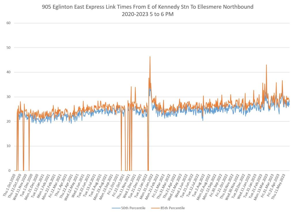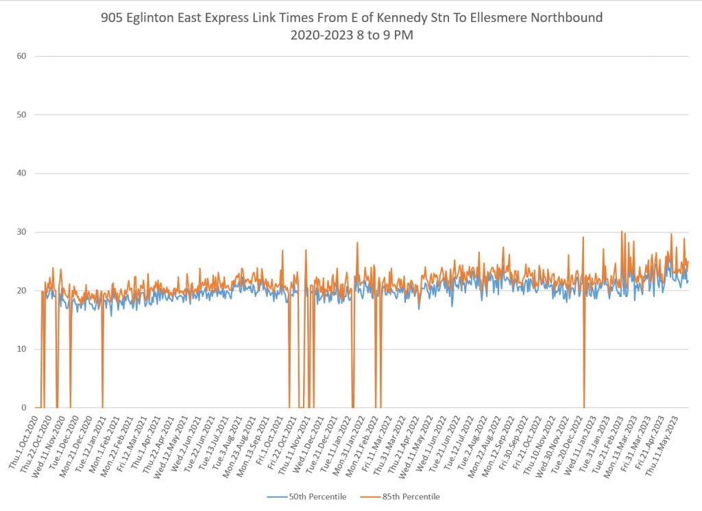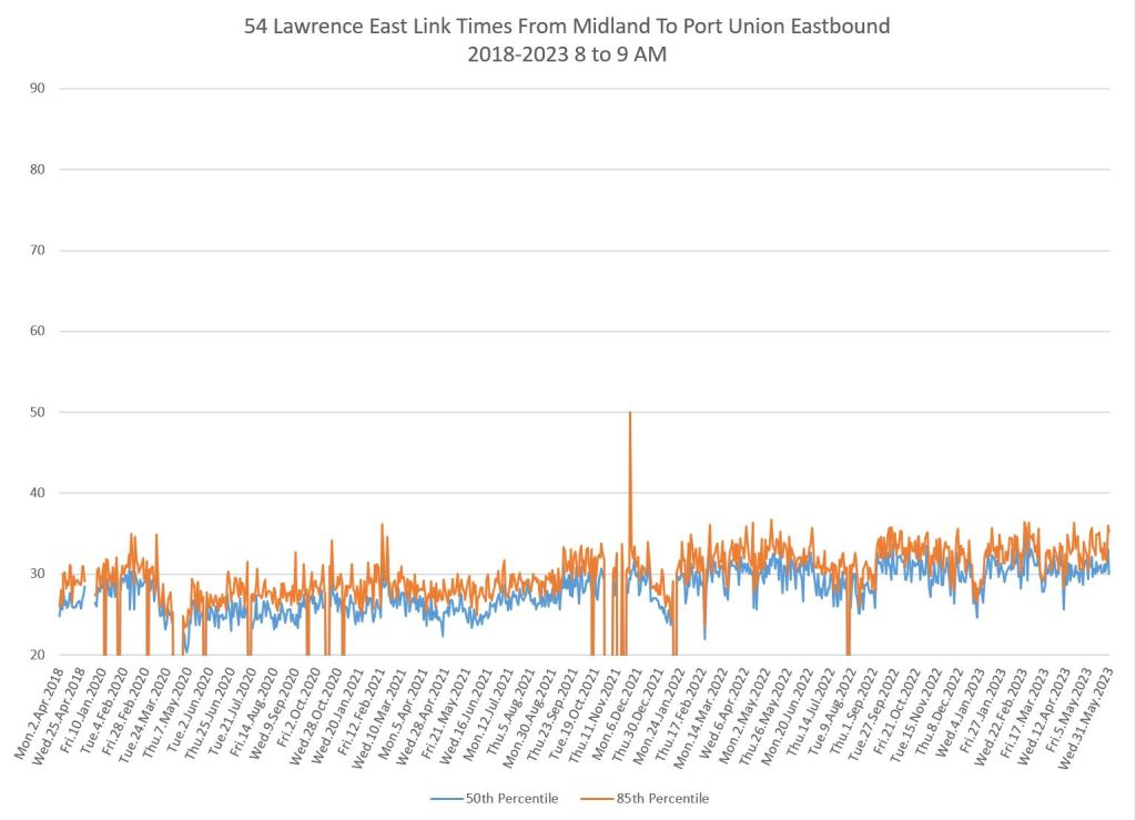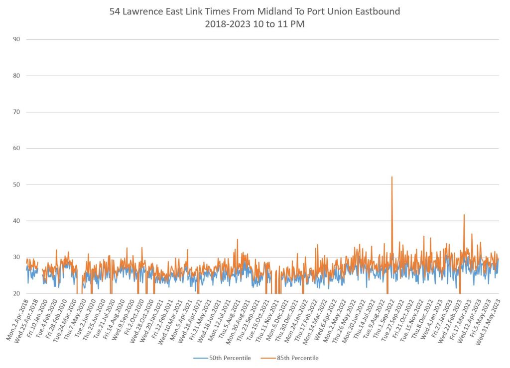 I do not have pre-pandemic data for this route as I was not tracking it at the time, nor for 986 Scarborough Express. The charts below show a small drop when the red lanes came into effect, although this is small. Travel times have grown slowly since 2020 and show a recent bump.