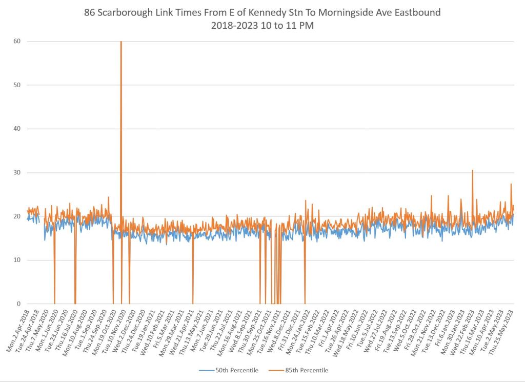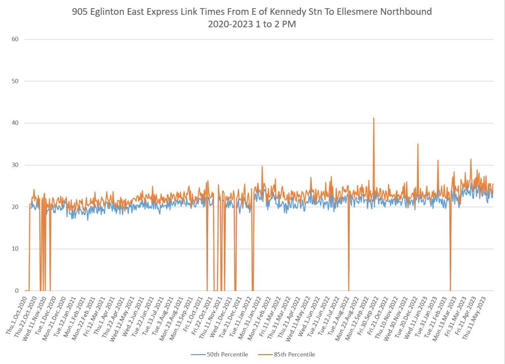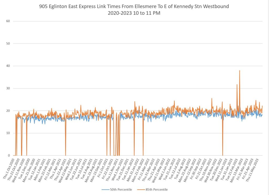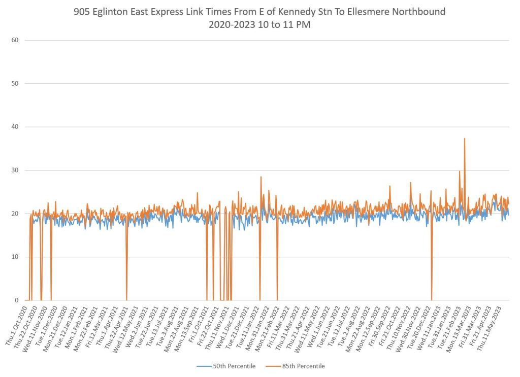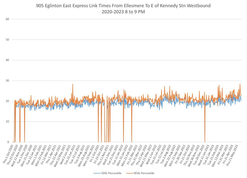 I do not have pre-pandemic data for this route as I was not tracking it at the time, nor for 986 Scarborough Express. The charts below show a small drop when the red lanes came into effect, although this is small. Travel times have grown slowly since 2020 and show a recent bump.