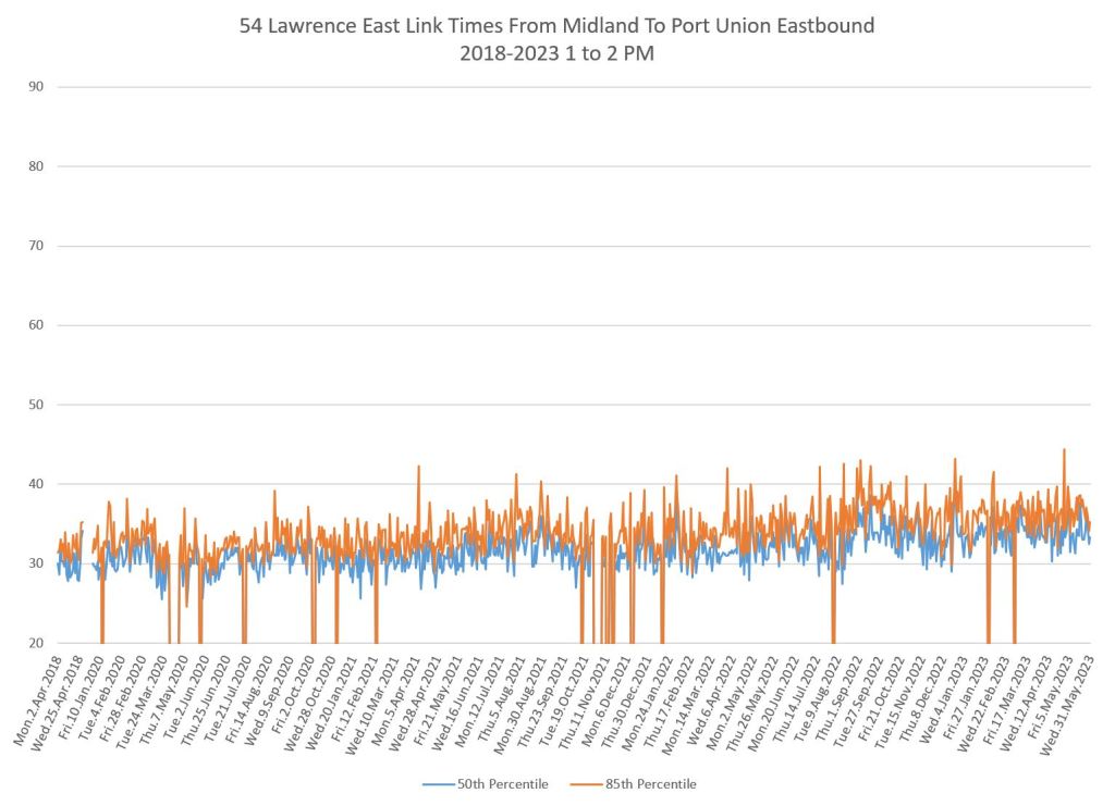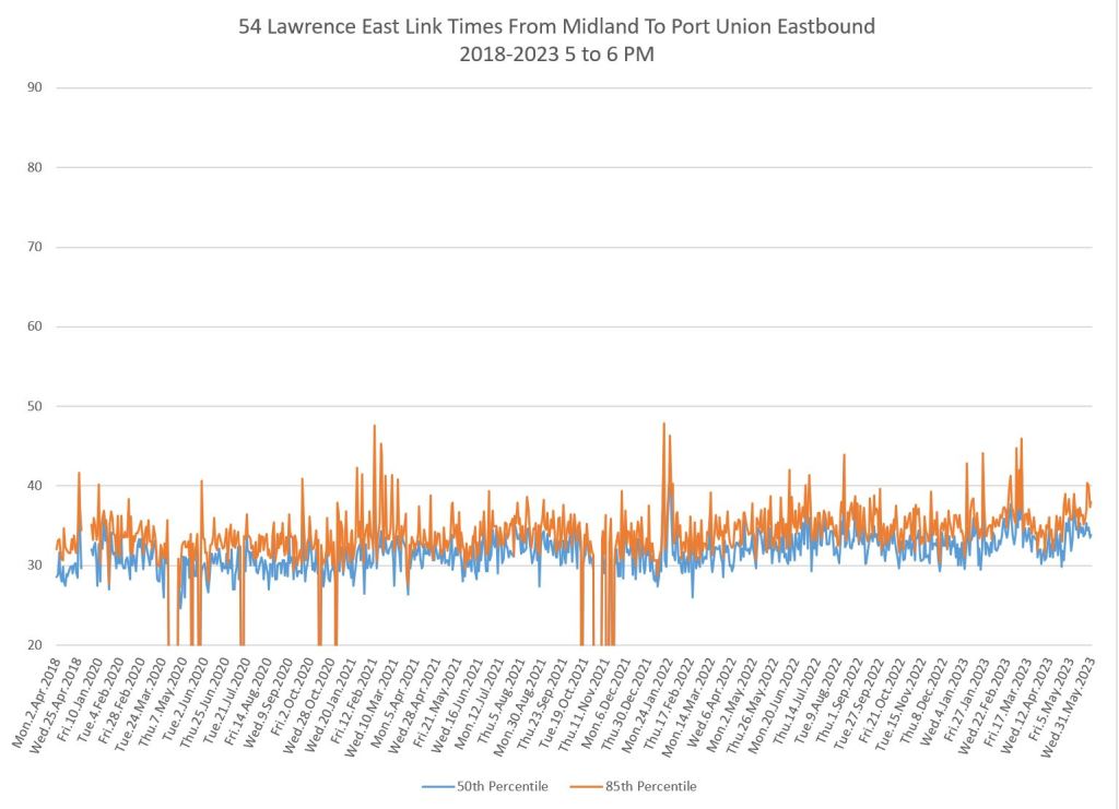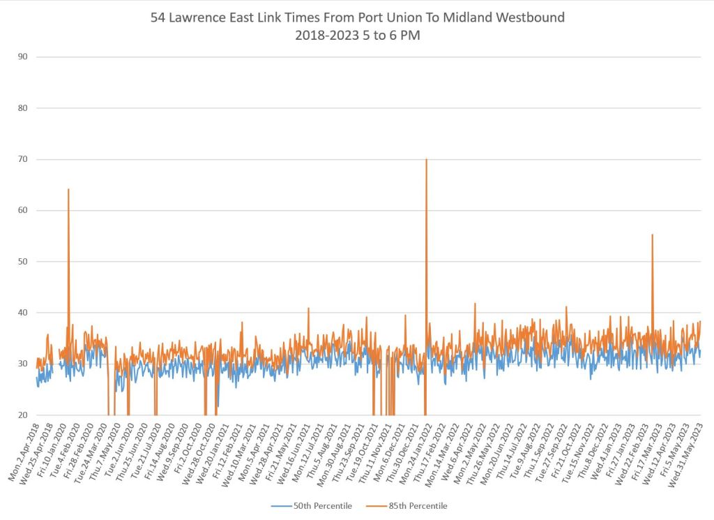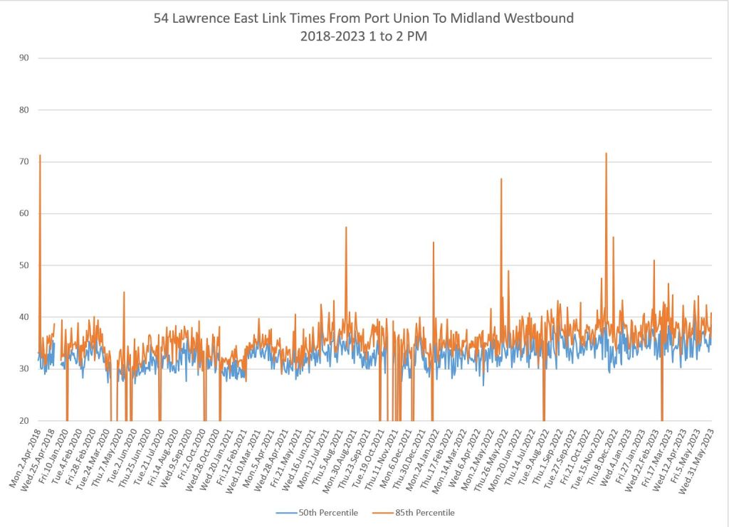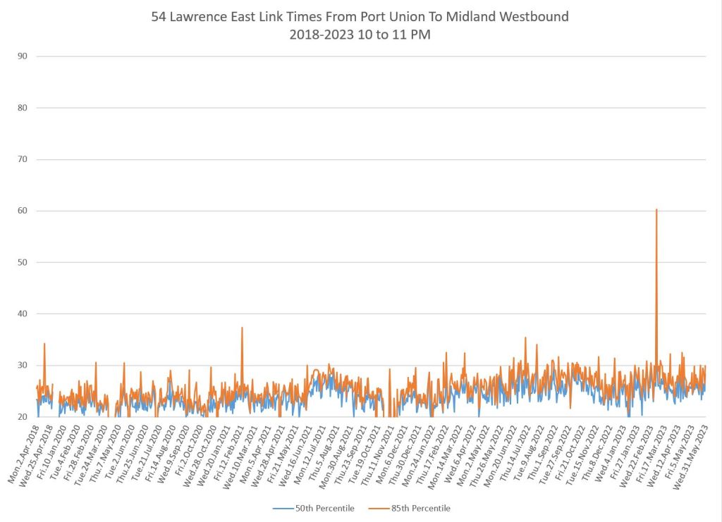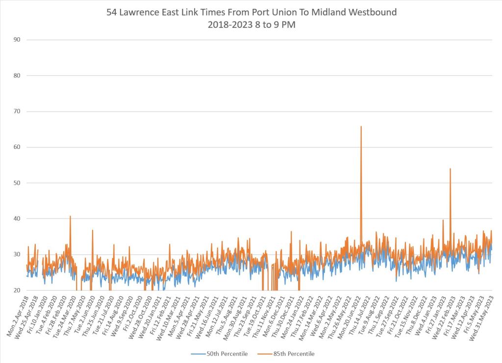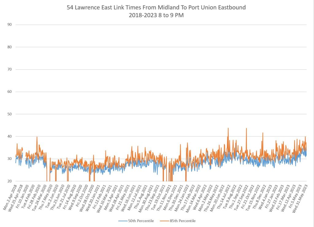 The situation varies from route to route and by time of day. In many cases, travel times have returned to pre-pandemic levels or higher, and some uptick is particularly notable in 2023. An important characteristic of these routes is that they do not serve the core area, but run in Toronto’s suburbs where bus ridership is strong and work-from-home had considerably less effect on demand than it does downtown.
