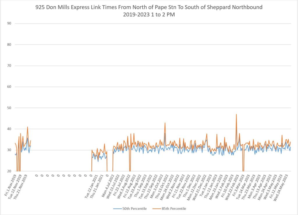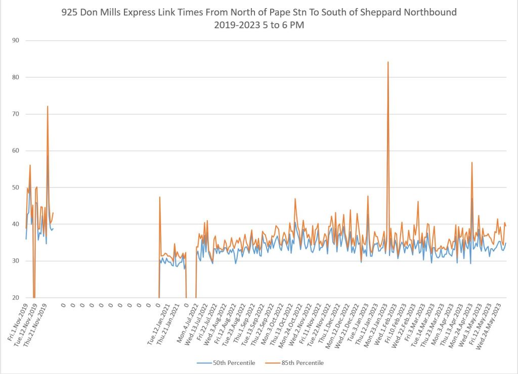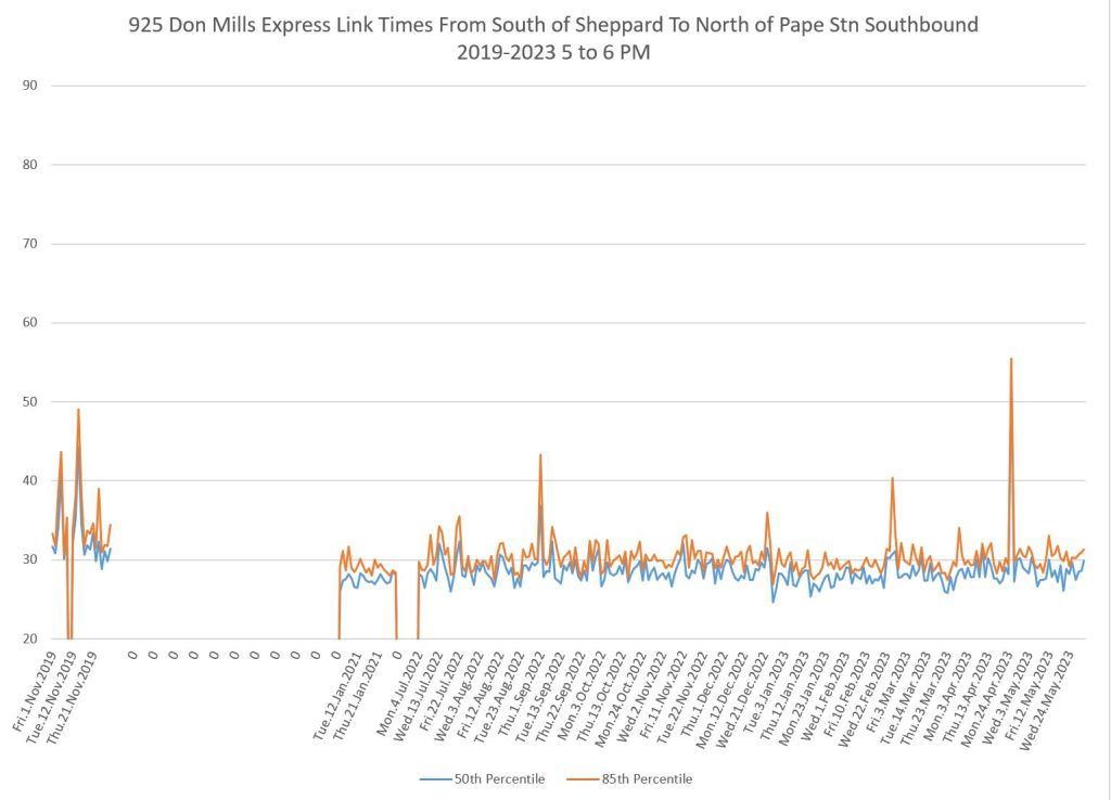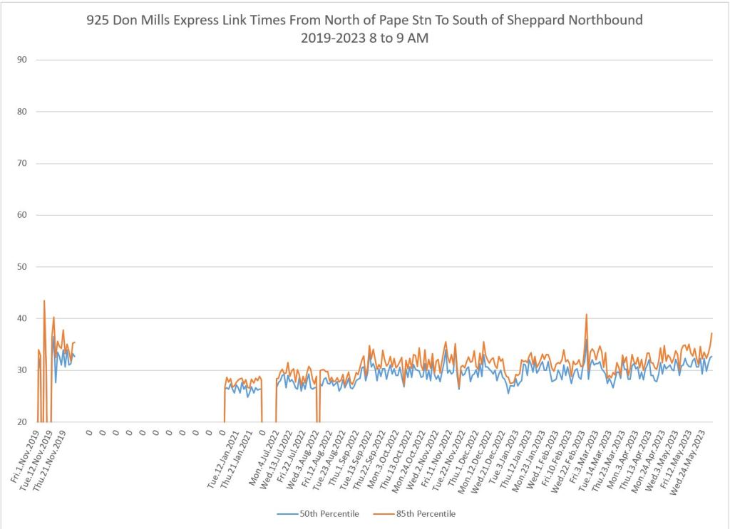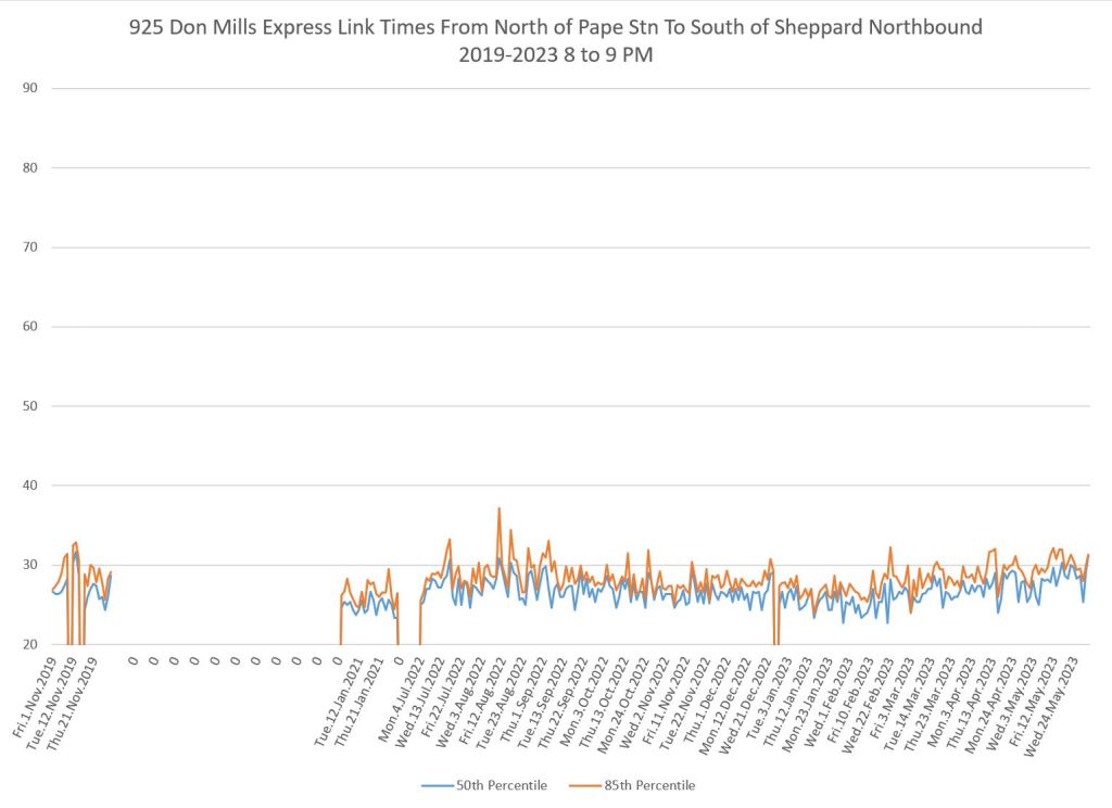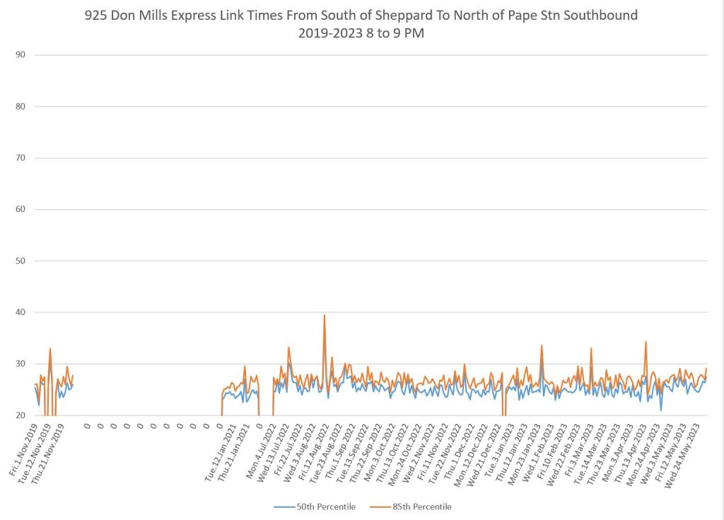The 925 Don Mills Express service shows a similar pattern to the local service above. Southbound am peak travel times are more or less back to pre-pandemic levels, while for some periods and directions, the values remain lower.