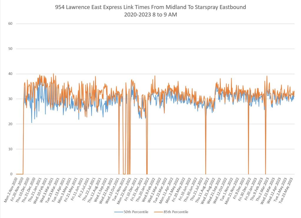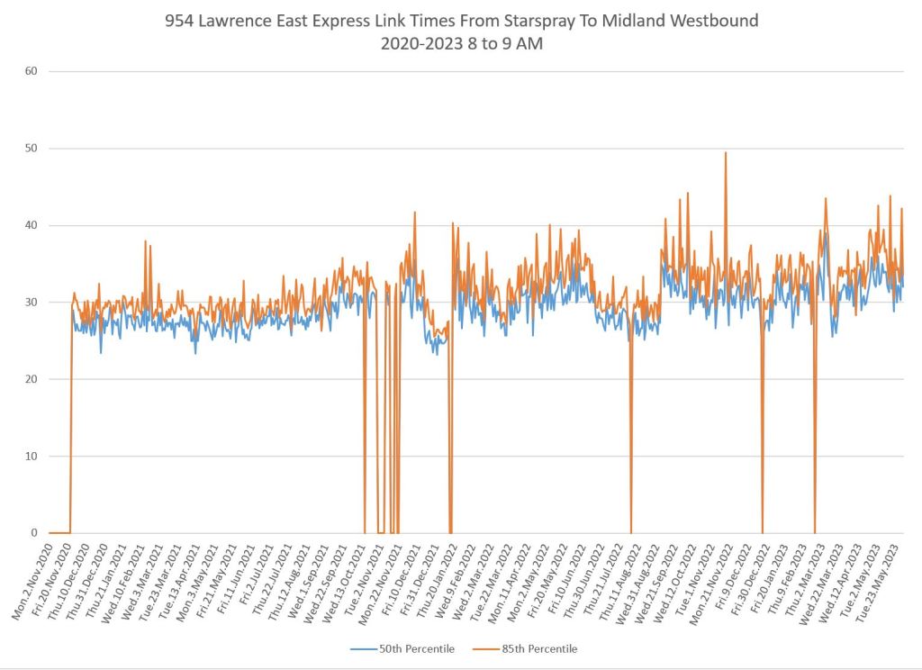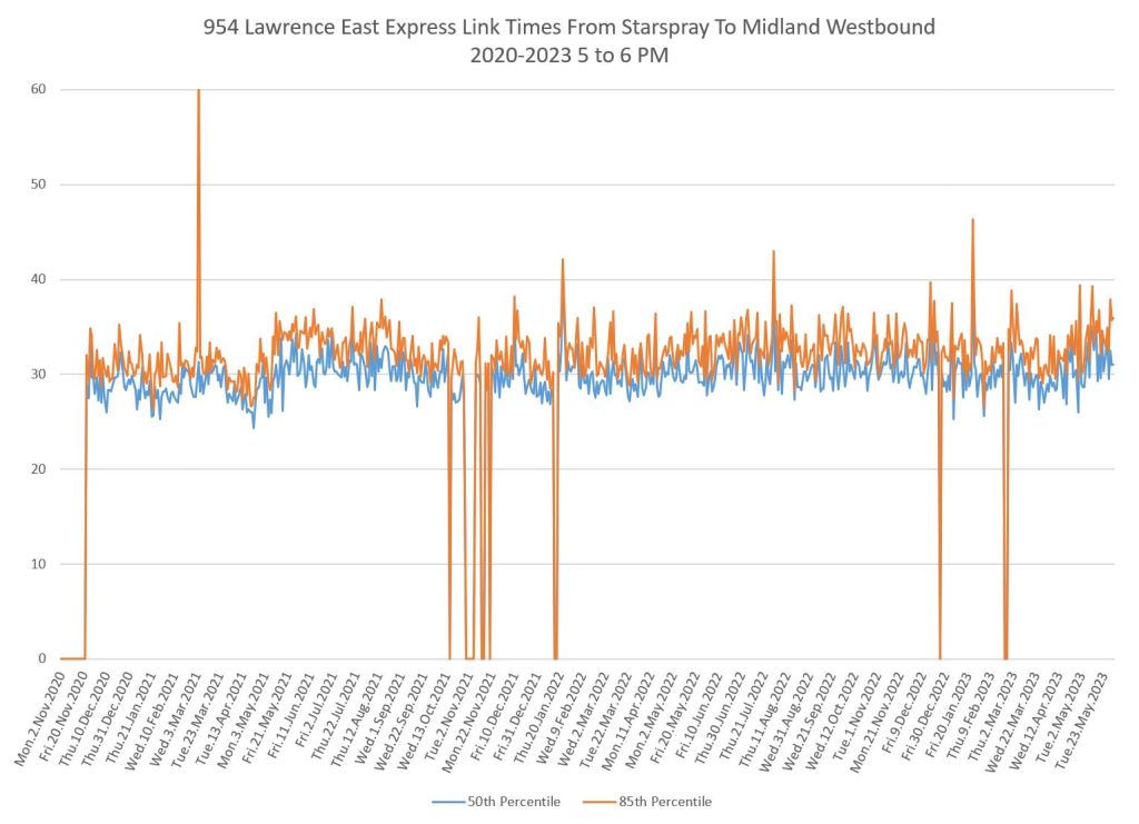 The 954 Lawrence East Express operates only in peak periods from Lawrence East Station eastward. Note that I have no pre-pandemic data for comparison and so these charts show only the evolution of travel times from fall 2020 onward.
