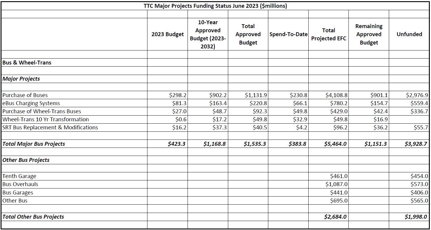 Notable by their absence are proposed LRT projects in Scarborough (Eglinton/Morningside/Malvern/Sheppard) and in the Waterfront. They will bring funding needs beyond those shown above.