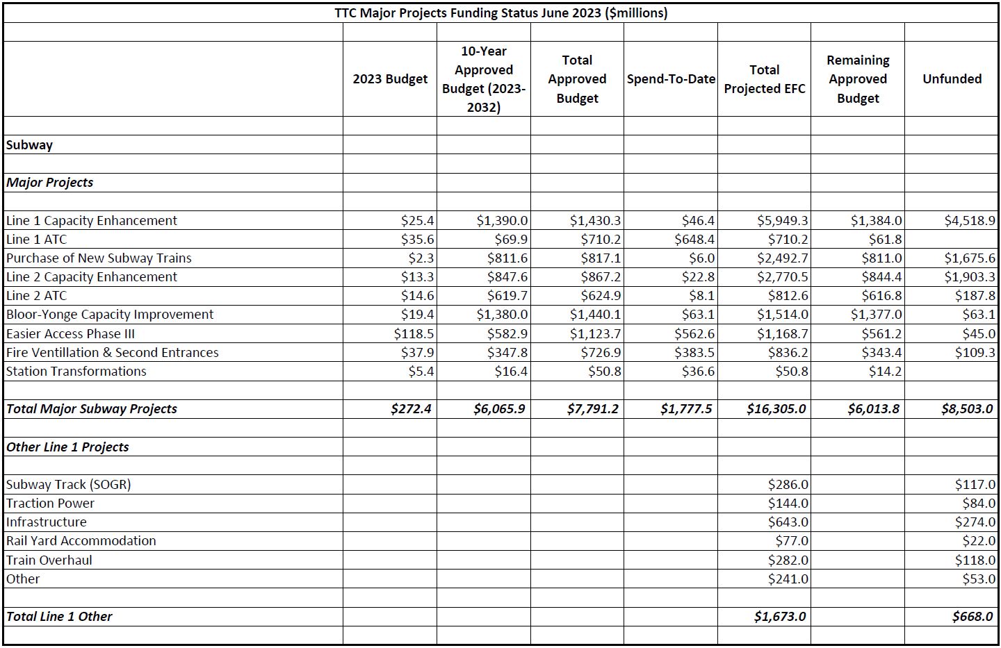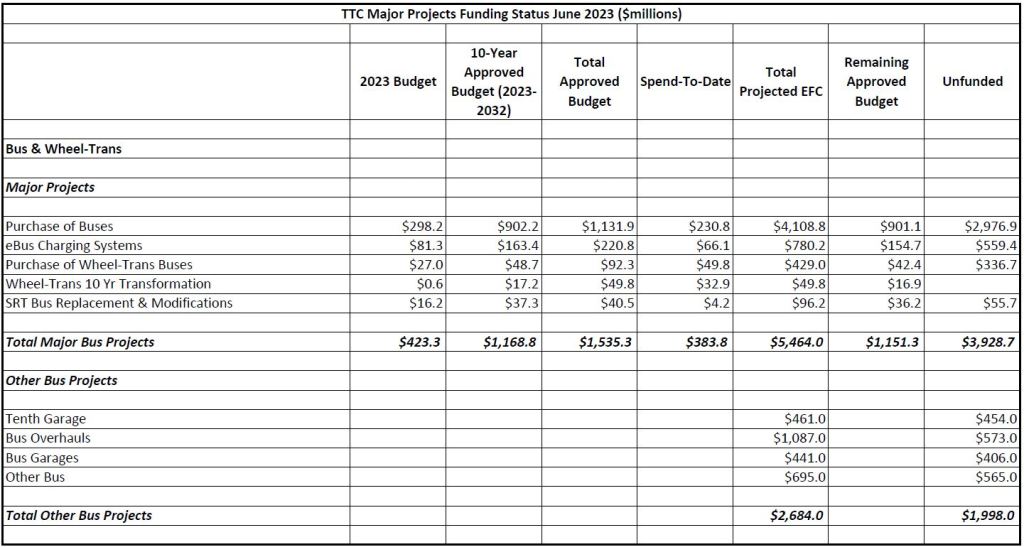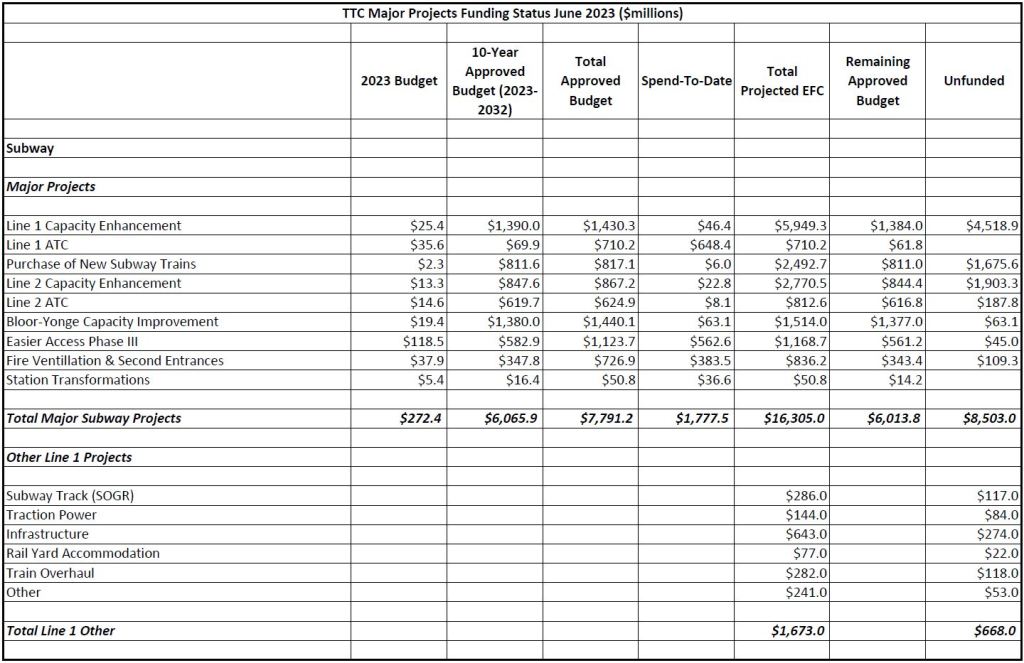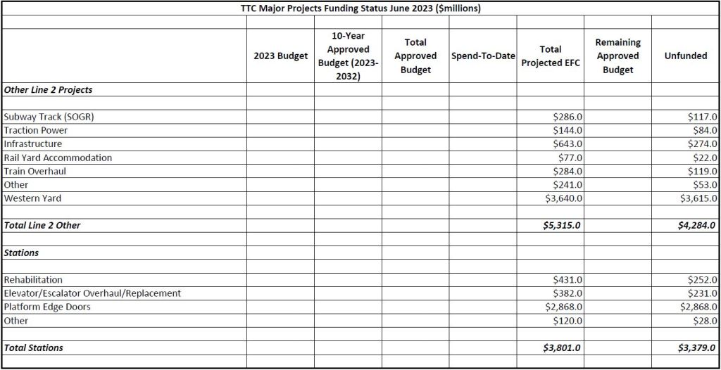 The two big projects in the “other” category are the proposed new yard west of Kipling Station ($3.615 billion) and platform edge doors ($2.868 billion). They are responsible for the lion’s share of unfunded “other projects”.