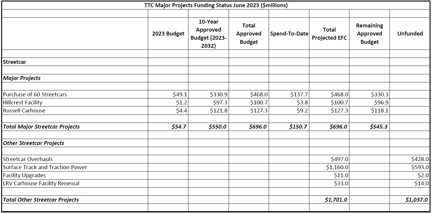 The breakdown here is on the same basis as the subway projects table above, but the list is much shorter. The only major projects are the purchase of 60 more streetcars (for which delivery begins in 2023) and the modifications at Hillcrest and Russell to provide updated storage and maintenance for the new fleet.