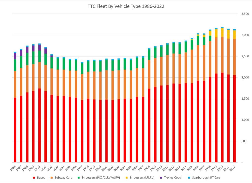 On the left is the count of vehicles. Buses (red) dominate the fleet followed by subway cars (orange) and streetcars (green, then yellow). There is a small complement of trolley buses up to 1993 (purple) and SRT cars (turquoise).