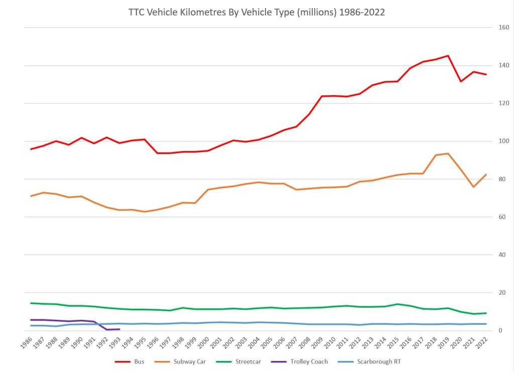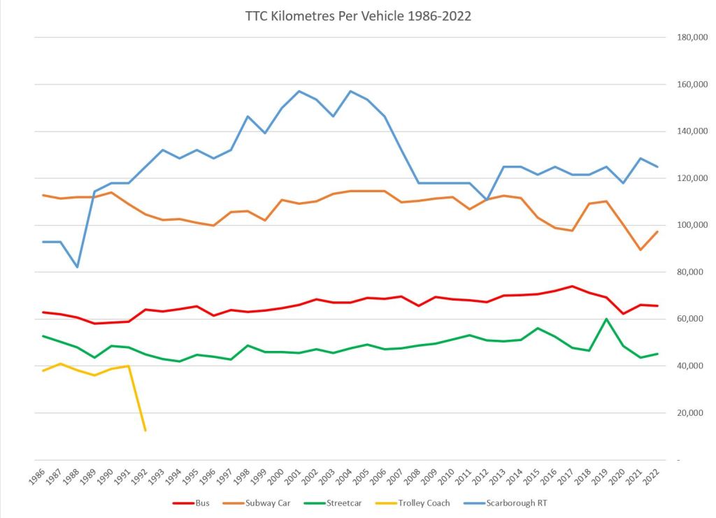 The middle chart is the number of vehicle kilometres operated by each portion of the fleet, and on the right is the average annual mileage per vehicle for each type. Note that the fleet mileage has not dropped as precipitously as the ridership because the TTC maintained much of its service through the pandemic era.
