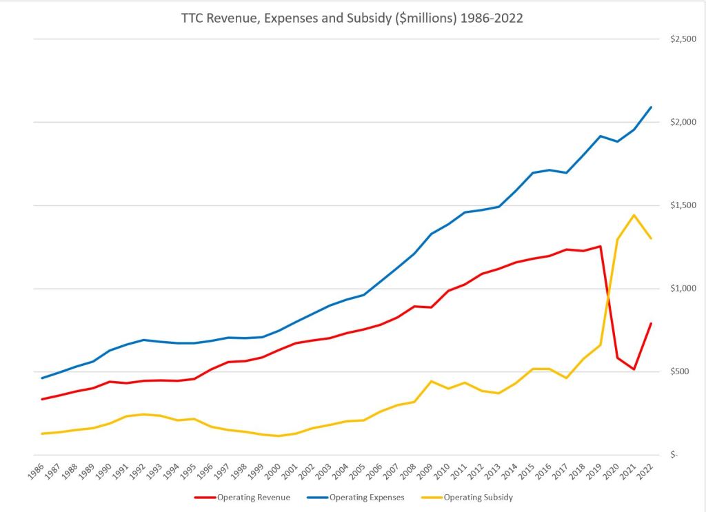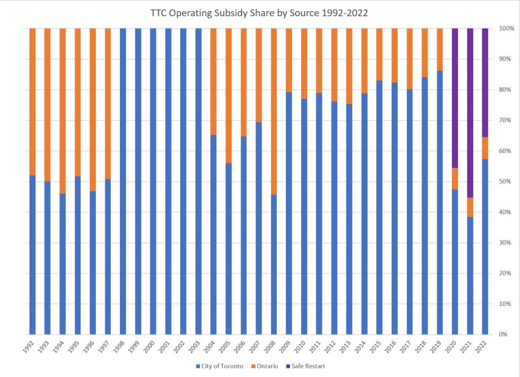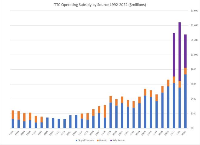 The chart on the left shows the TTC’s operating subsidy broken down by source. The extra pandemic era funding greatly increases the total in recent years (purple), and the trend in “normal” subsidy is clear following the top of the orange section of the chart.