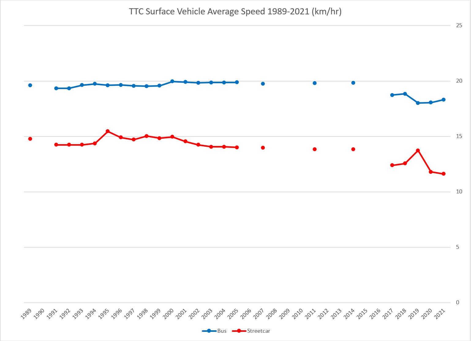 The average speed of surface vehicles can be calculated from the reports published (irregularly in some years) giving route level stats including vehicle hours and mileage. From these the totals across all routes yield the average speed. The chart below shows the difference between bus and streetcar routes. Empty years are those when the TTC did not publish any data.