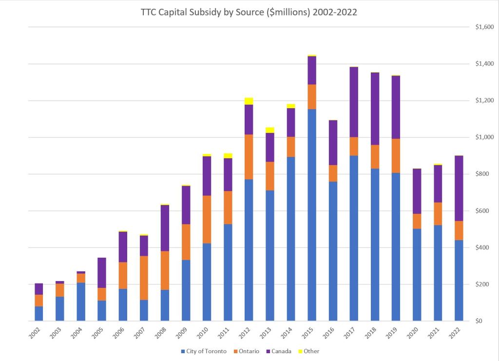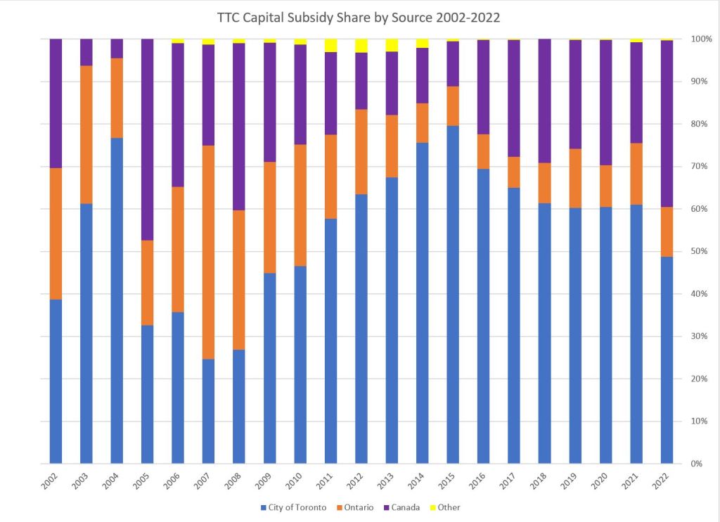 The chart begins in 2002 because of the lower granularity of reporting of capital subsidies in TTC financial statements before that time. Also, there was a period starting with the Harris era at Queen’s Park but continuing into the McGuinty era where capital grants were announced and paid in blocks, but actually spent from reserves over several years. This complicates tracking the shares over that period, and I chose to begin after the funding process stabilized.