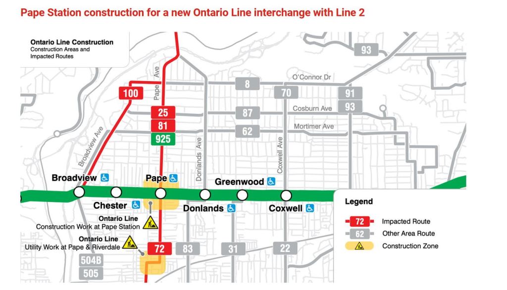 Metrolinx’ construction of the Pape Station interchange with the Ontario Line will have a major effect on transit service near Pape and Danforth. The OL will also affect service near the future Gerrard Station, but to a smaller degree.