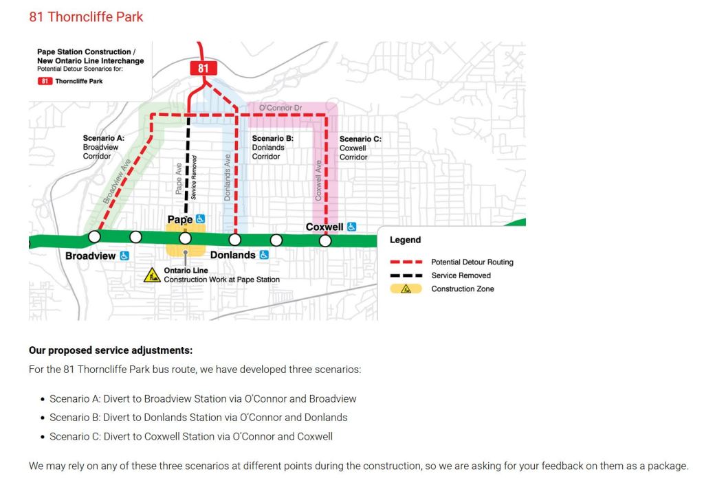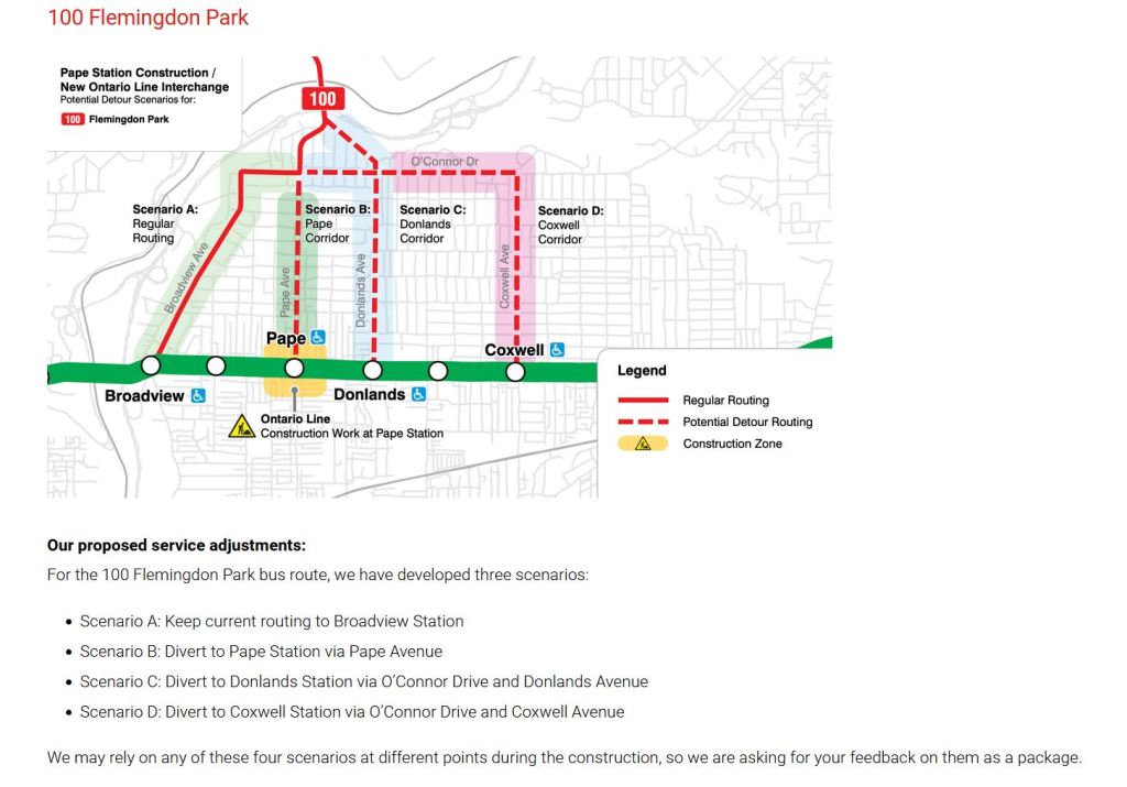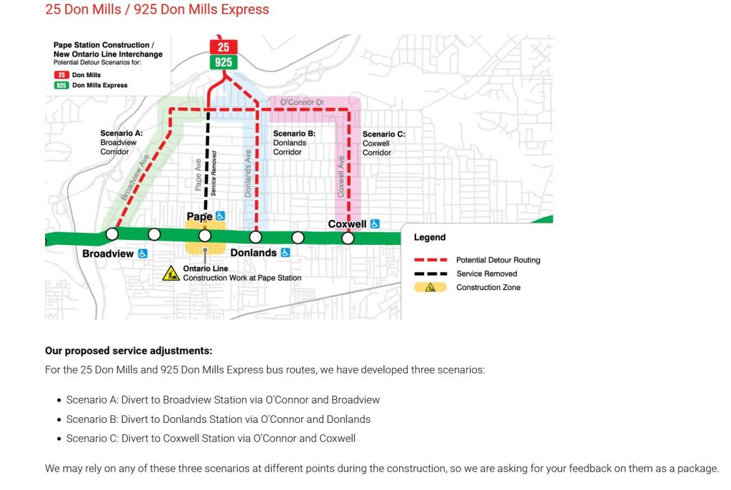 The TTC proposes to redistribute routes serving Pape Station to other nearby locations, and they state that “diverting the majority of these routes may be required as soon as 2024”.