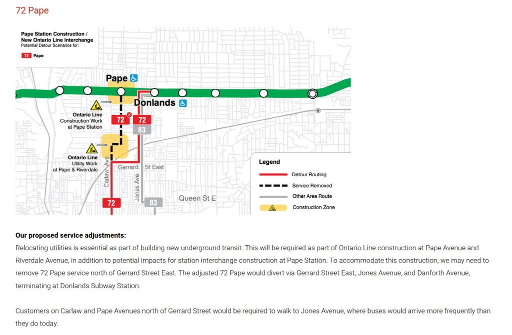 Utility work at Pape and Riverdale may cause the 72 Pape bus south of Danforth to be rerouted to Donlands Station. This would produce the irony of a bus that never operates on its namesake street.
