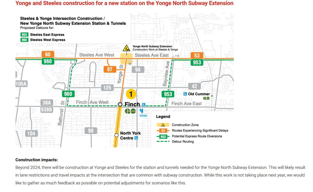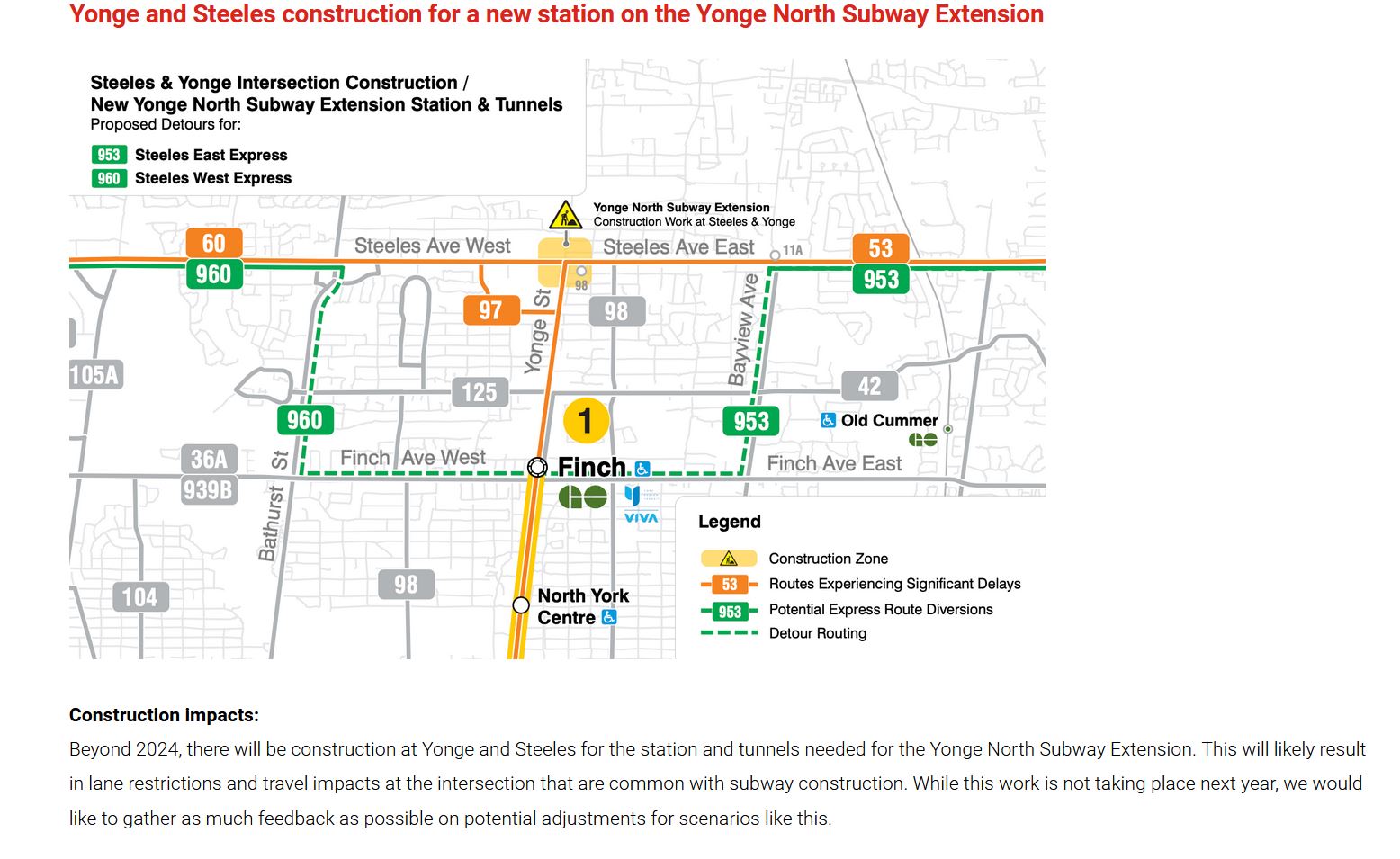 Construction of the planned Steeles Station will constrain road capacity at that location. The TTC proposes to reroute the express services on Steeles East (953) and West (960) to Finch Station via Bayview and Bathurst respectively. Local services (53, 60 and 97) would remain on Yonge Street.