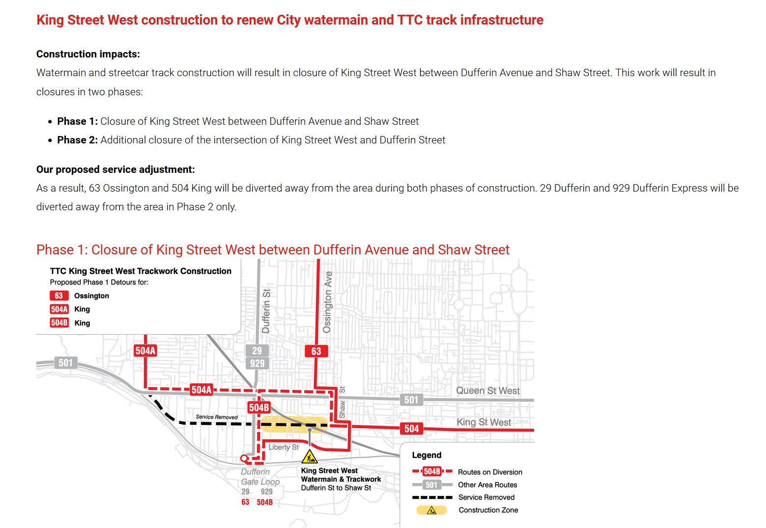 During the first phase (whose length is unclear), all 504 King cars would divert north to Queen with the 504A Dundas West Station service continuing to Roncesvalles, and the 504B Dufferin Gate service turning south from Queen to the regular terminus at Dufferin Loop.