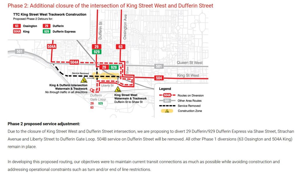 The second phase of the project involves the reconstruction of the King/Dufferin intersection requiring a complete closure for about three weeks based on past experience. Routes would be revised as shown below. There would be no change to the 504A King and 63 Ossington diversions, and all King service would operate west from Dufferin on Queen. It is not clear whether the 504B cars will run to Dundas West Station, or if they will terminate elsewhere such as Fleet Loop (west of Bathurst) or Charlotte Loop (at Spadina).