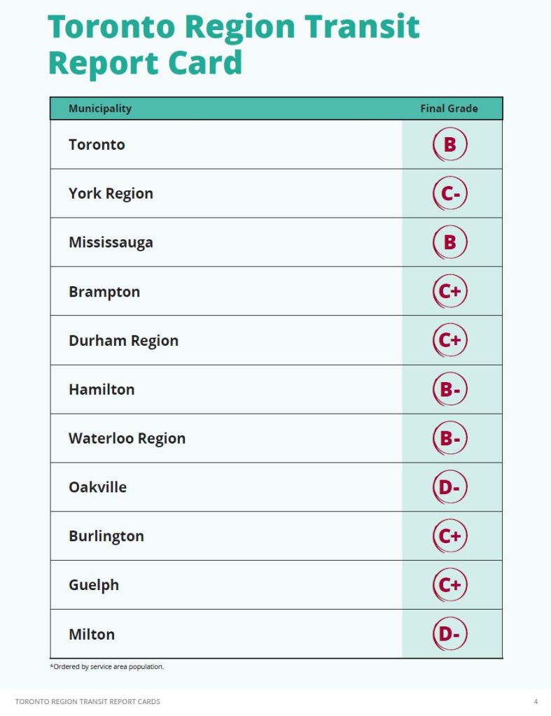Needs Improvement: Toronto Region Transit Report Cards is the title cited on the main announcement page for this report.