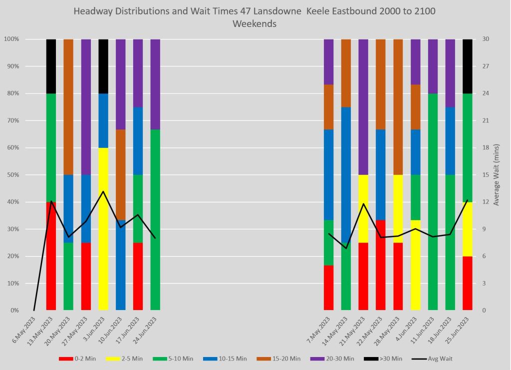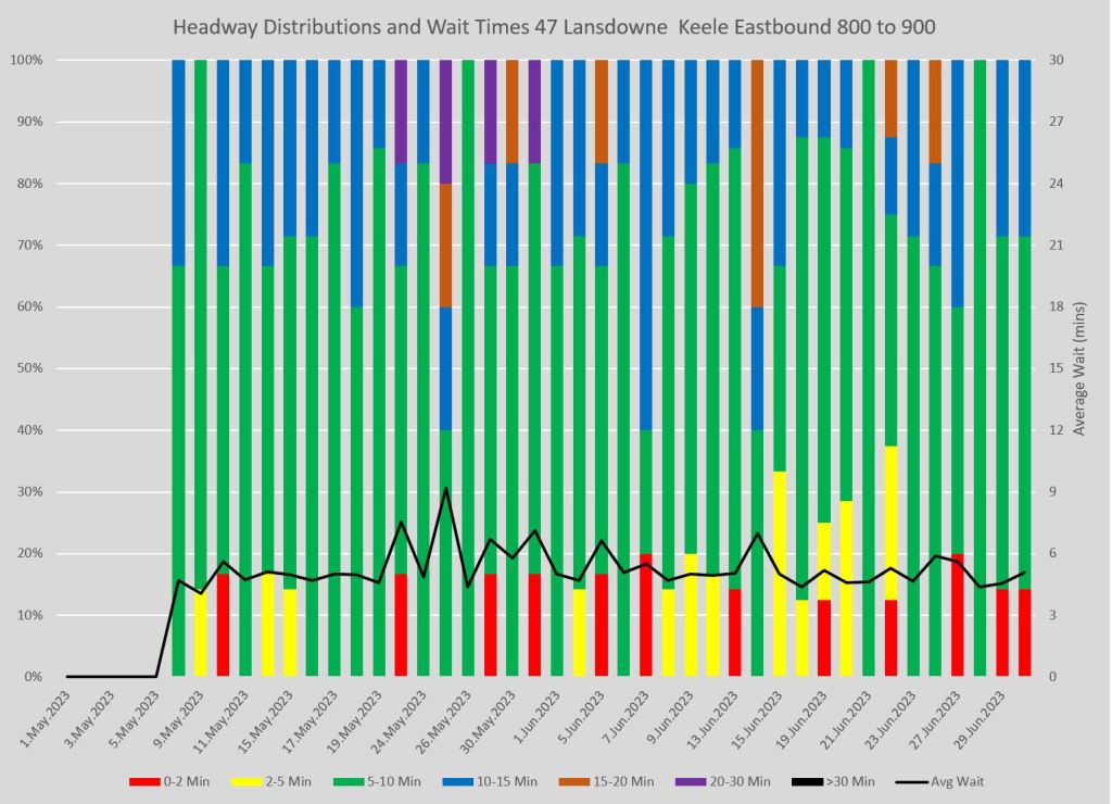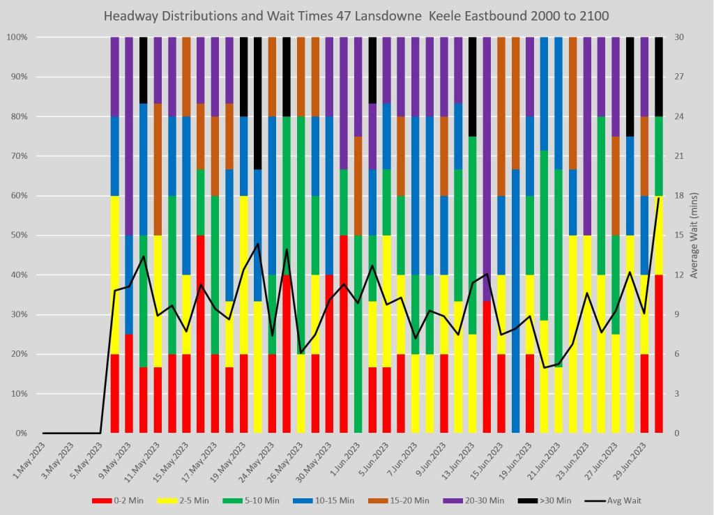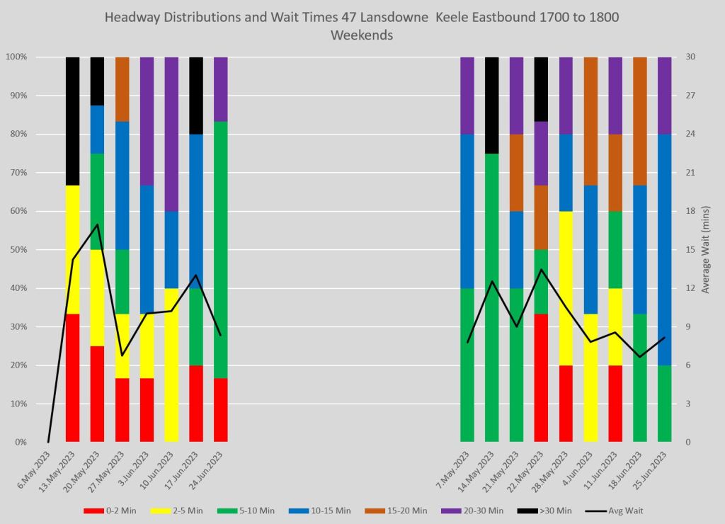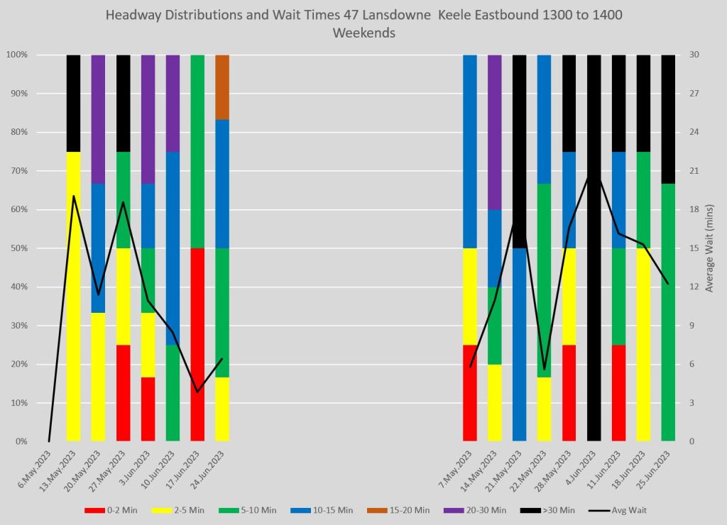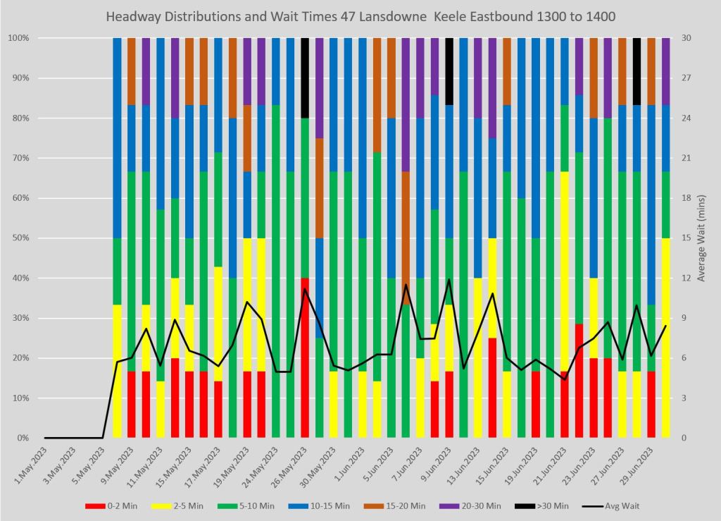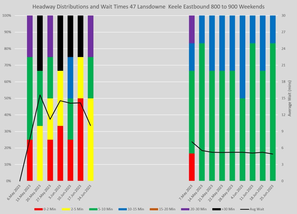 I will publish a review of the 512 and 47 services later this summer, but as a preview here are charts of the headways and average wait times eastbound at Keele on the 47 Lansdowne replacement bus. Note the prevalence of very short headways (red) and very long ones (purple and black).