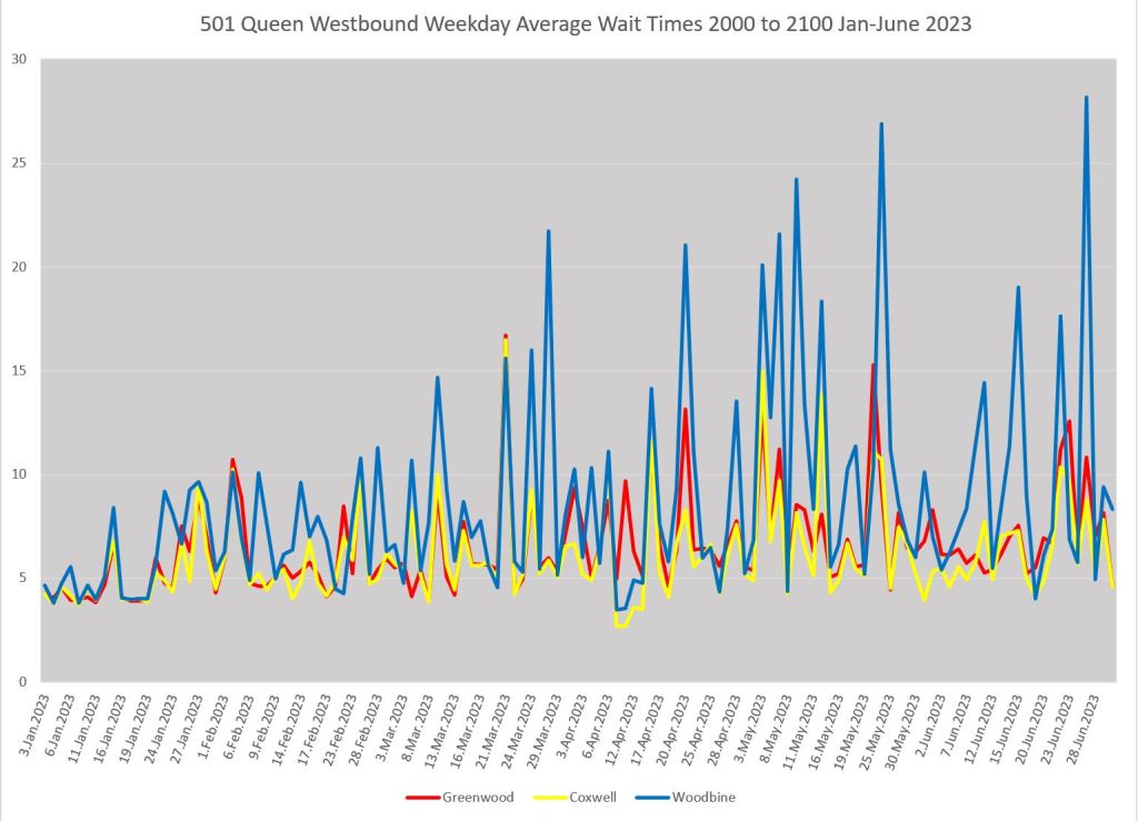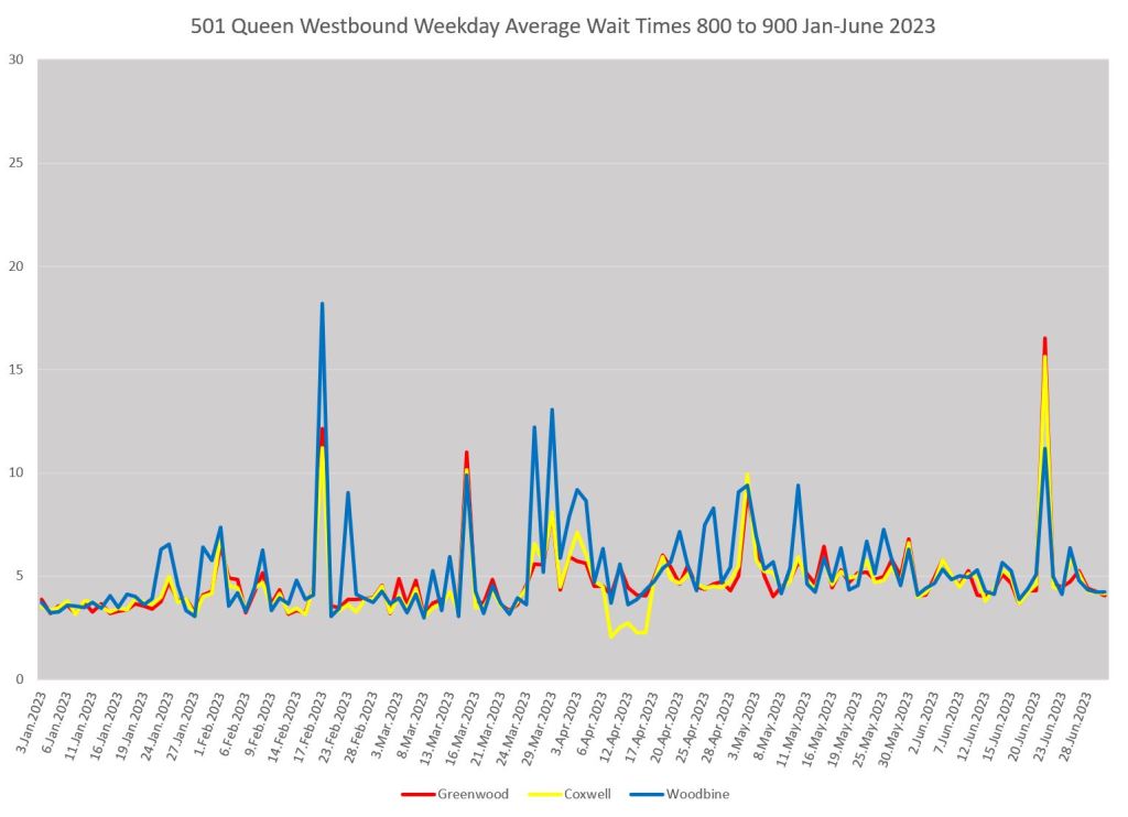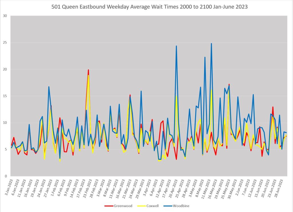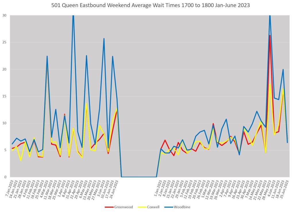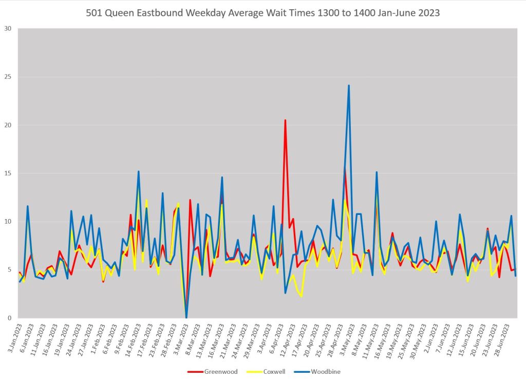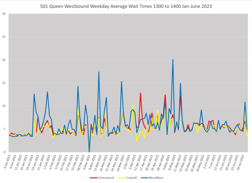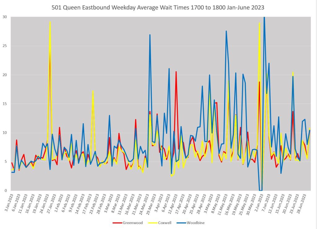 The blue lines show average wait times east of Woodbine Loop, and these values are quite often higher than wait times at Coxwell (yellow) or Greenwood (red) indicating that less service reached that point. Moreover, the blue line bounces around considerably from day to day showing how riders do not have even a service that is “reliably undependable”.