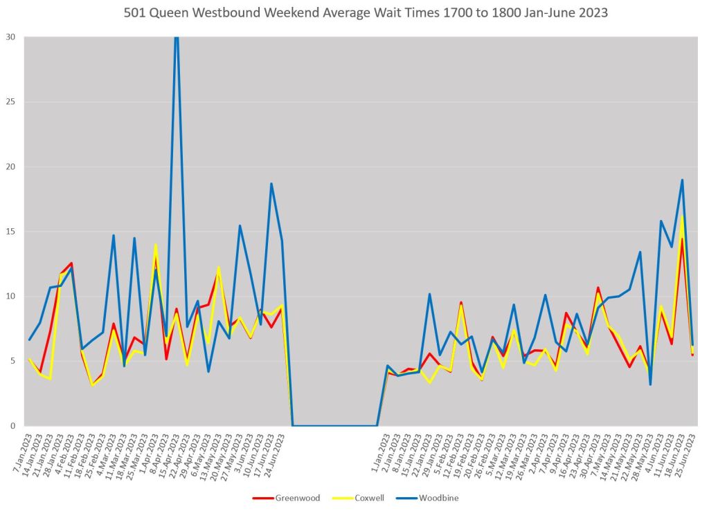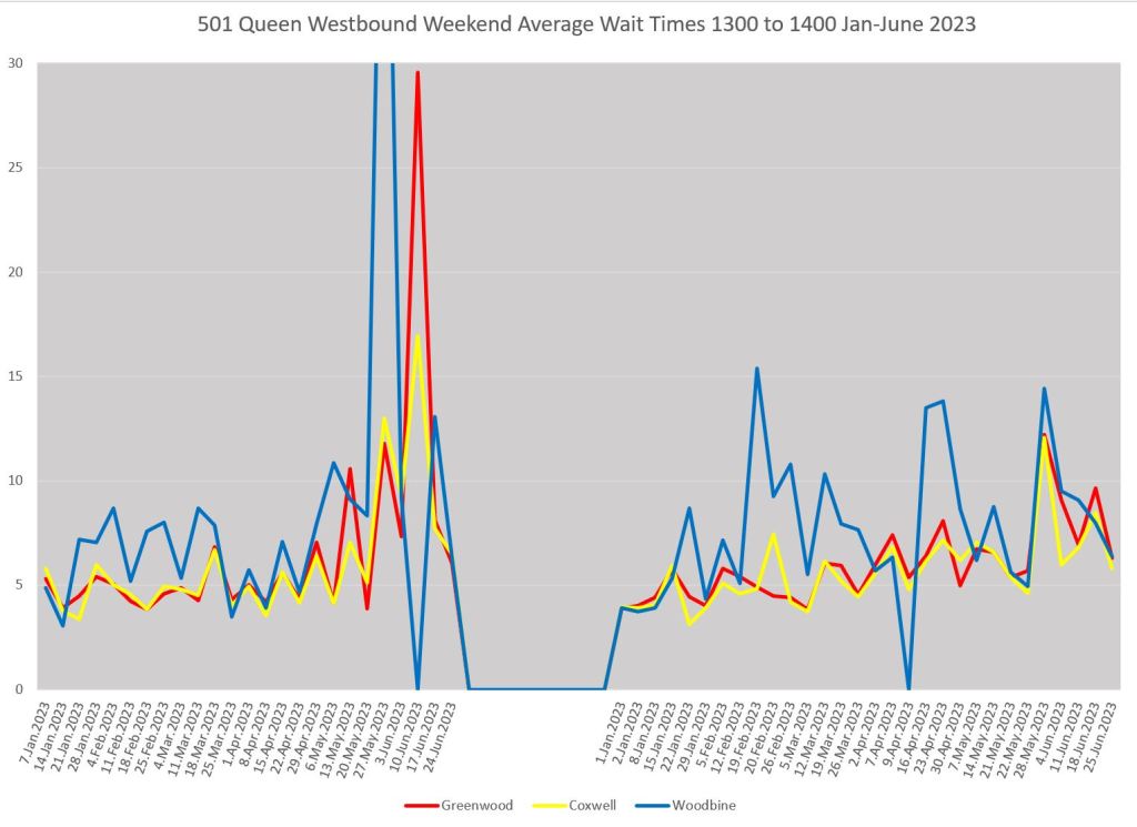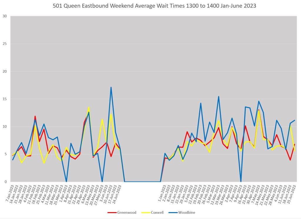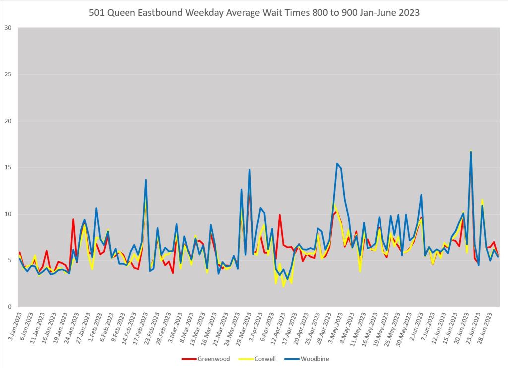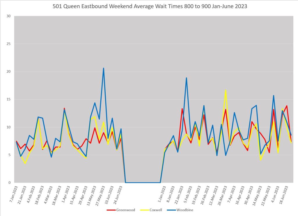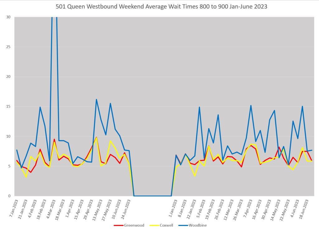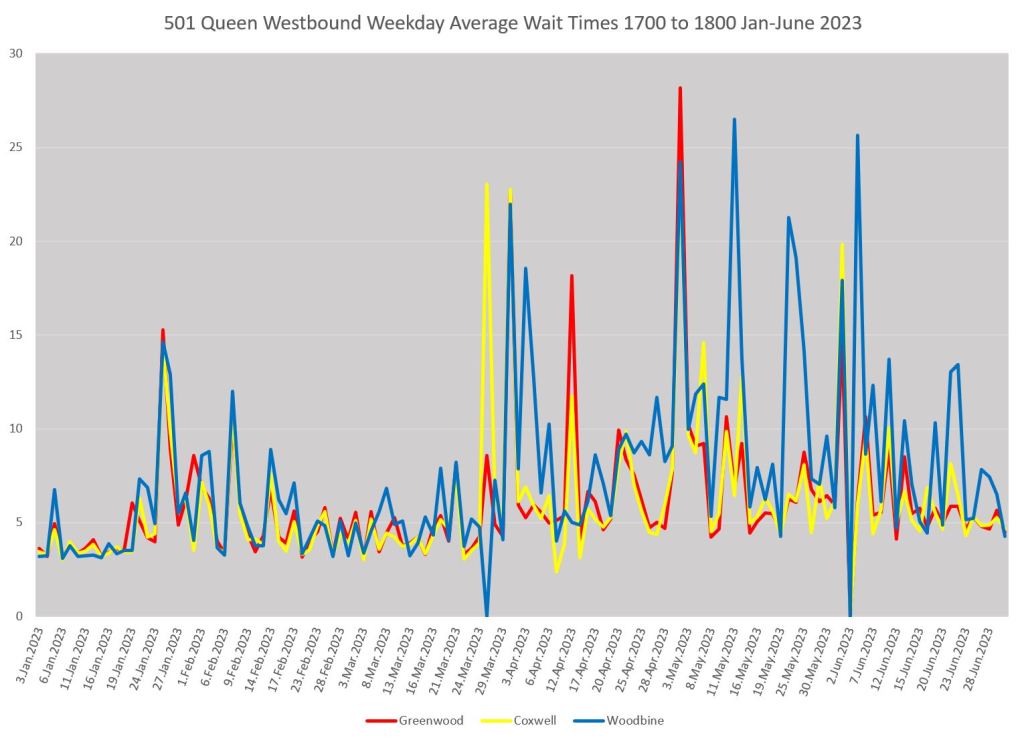 The blue lines show average wait times east of Woodbine Loop, and these values are quite often higher than wait times at Coxwell (yellow) or Greenwood (red) indicating that less service reached that point. Moreover, the blue line bounces around considerably from day to day showing how riders do not have even a service that is “reliably undependable”.
