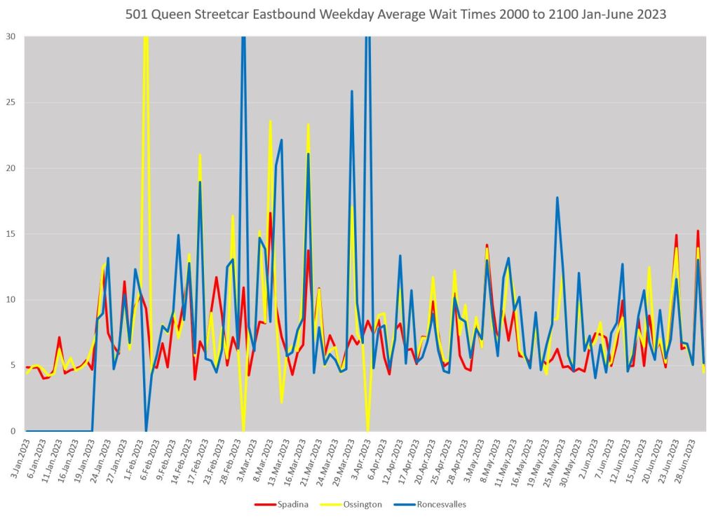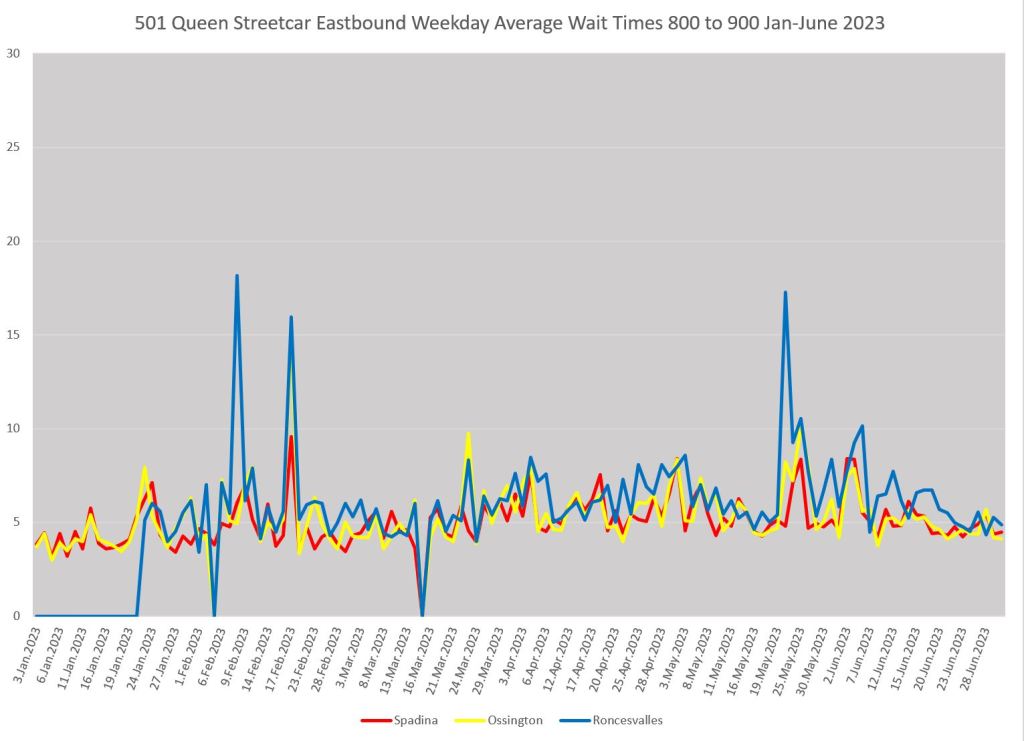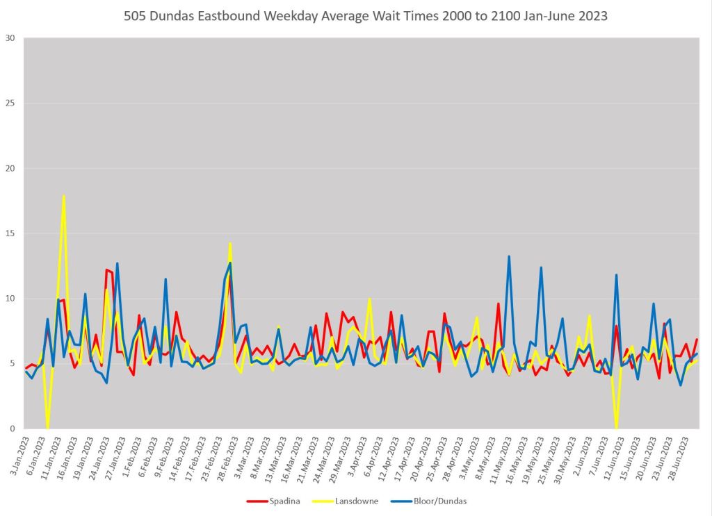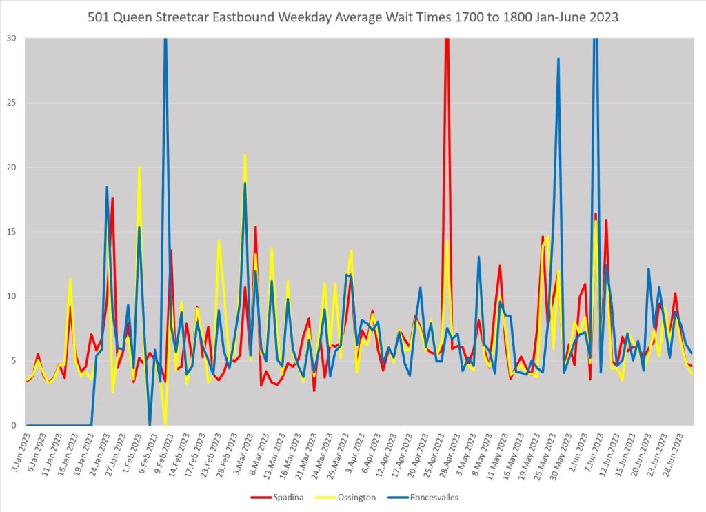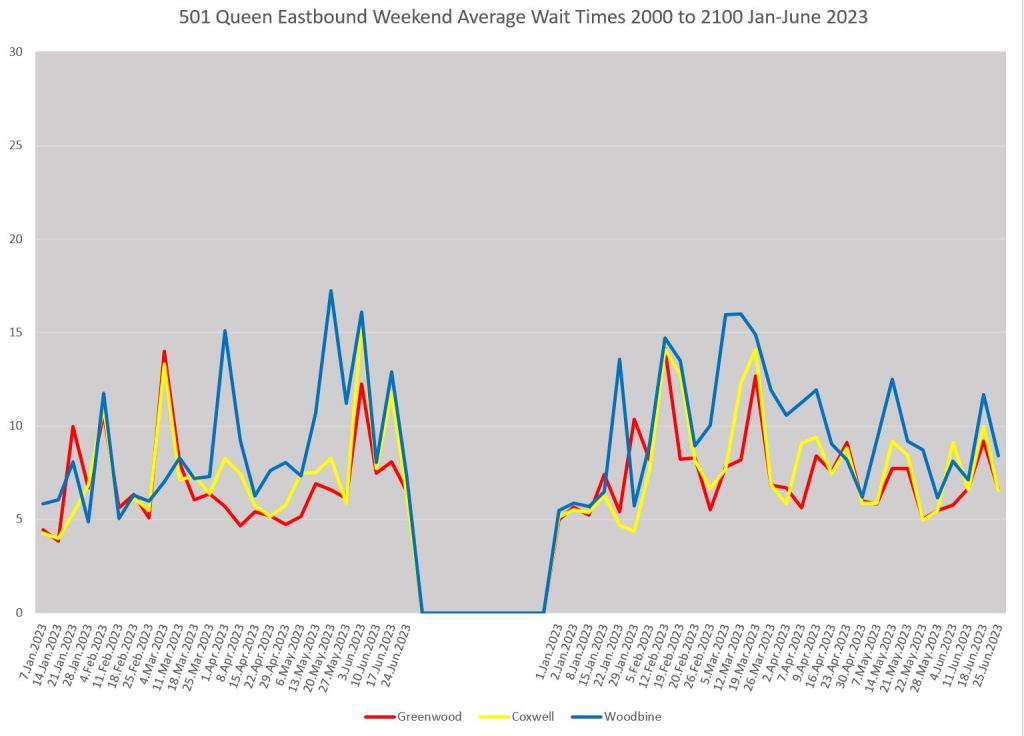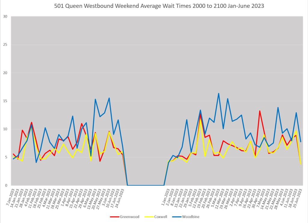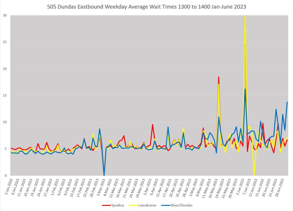 The blue lines show average wait times east of Woodbine Loop, and these values are quite often higher than wait times at Coxwell (yellow) or Greenwood (red) indicating that less service reached that point. Moreover, the blue line bounces around considerably from day to day showing how riders do not have even a service that is “reliably undependable”.