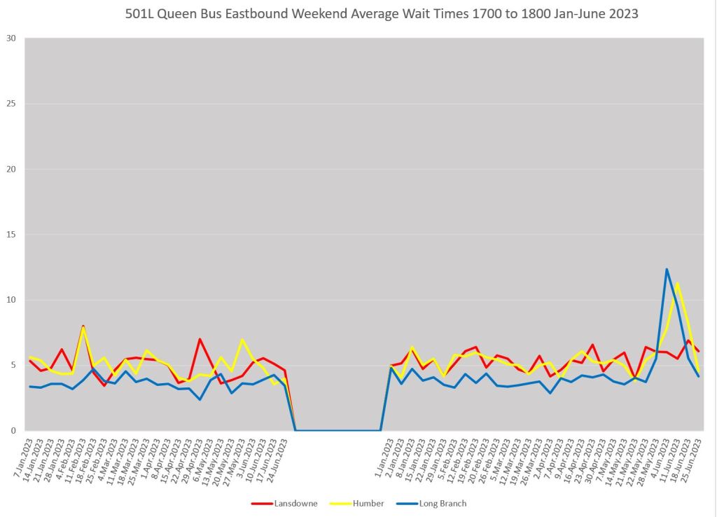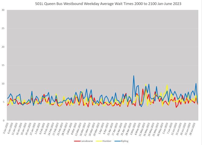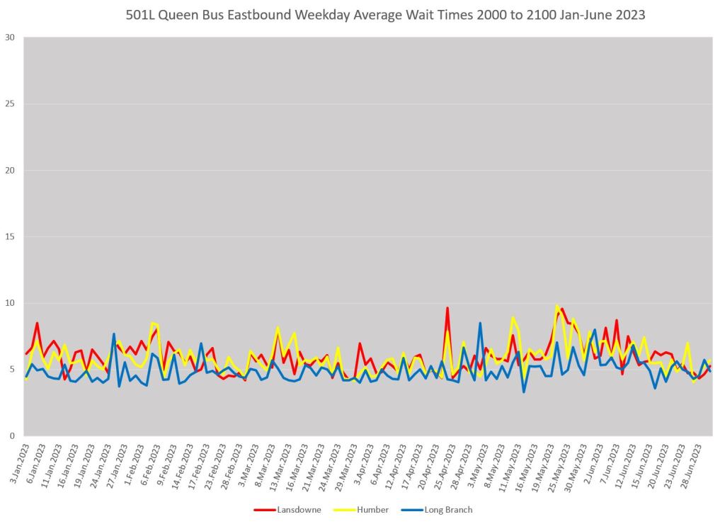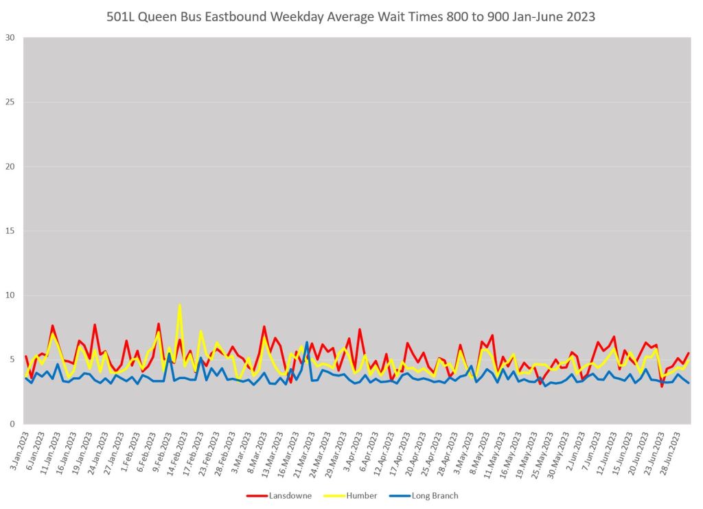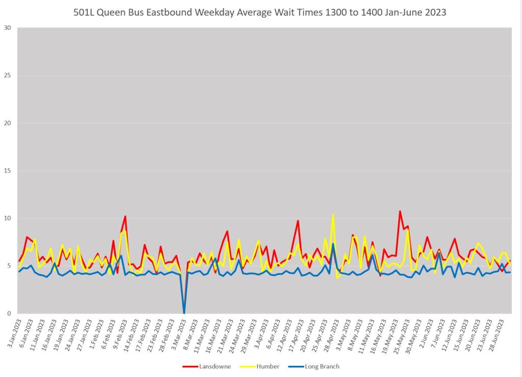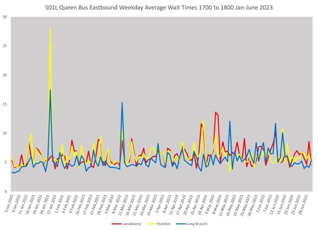 Although there are small differences in average wait times, the values tend to stay together as buses move west as seen by data at Dufferin, Humber and Kipling. Similarly, eastbound values at Long Branch, Humber and Landowne follow each other with few disruptions.