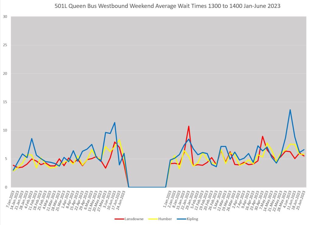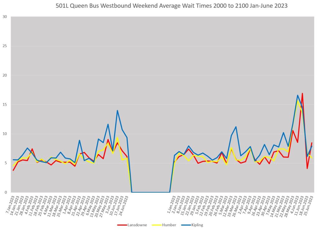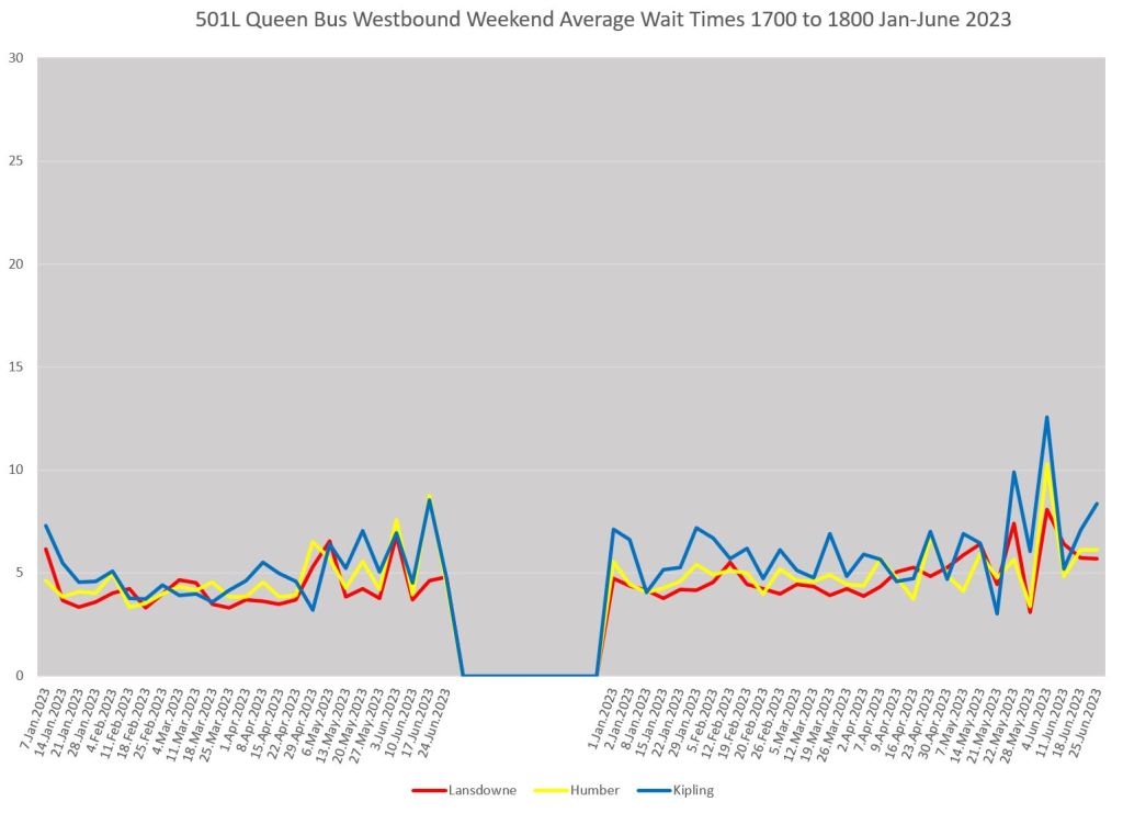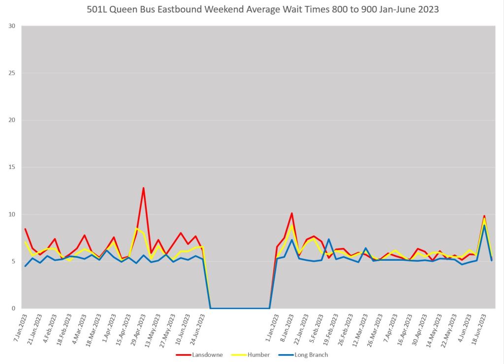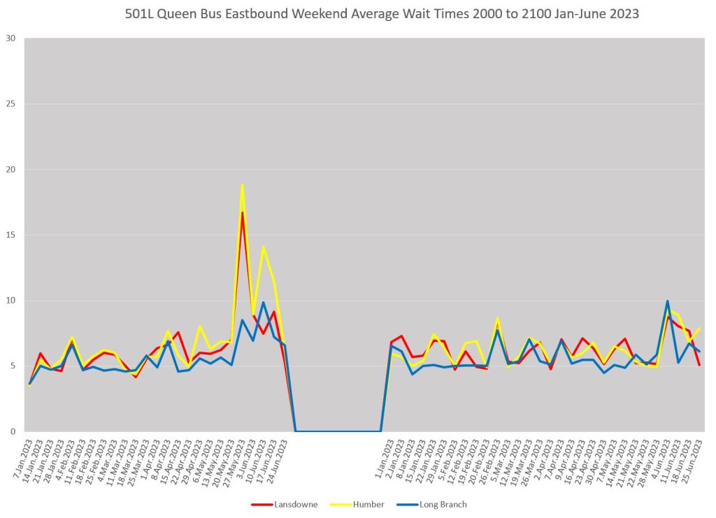 Although there are small differences in average wait times, the values tend to stay together as buses move west as seen by data at Dufferin, Humber and Kipling. Similarly, eastbound values at Long Branch, Humber and Landowne follow each other with few disruptions.