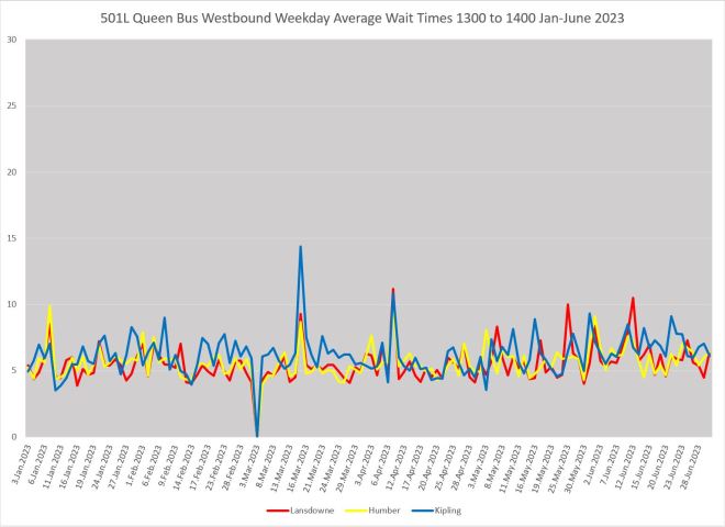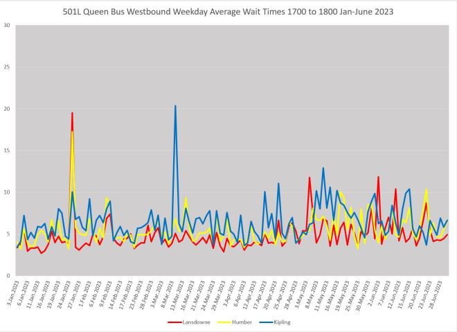 There are a few exceptions where a spike in average wait times on the outer end of the line did reflect short turns. For example, on March 9 there is a spike in wait times caused by severe traffic congestion between Dufferin and Roncesvalles that triggered short turns west of Royal York, but this was a one-day effect. In early May, service on the 501L tended to bunch badly in the afternoon, compounded by congestion near Roncesvalles. This is reflected in long average wait times outbound at Kipling by which time bunching hits its maximum even though the actual disruption is further east.
