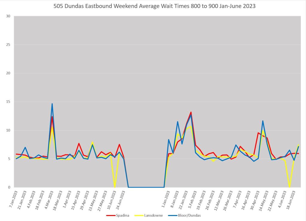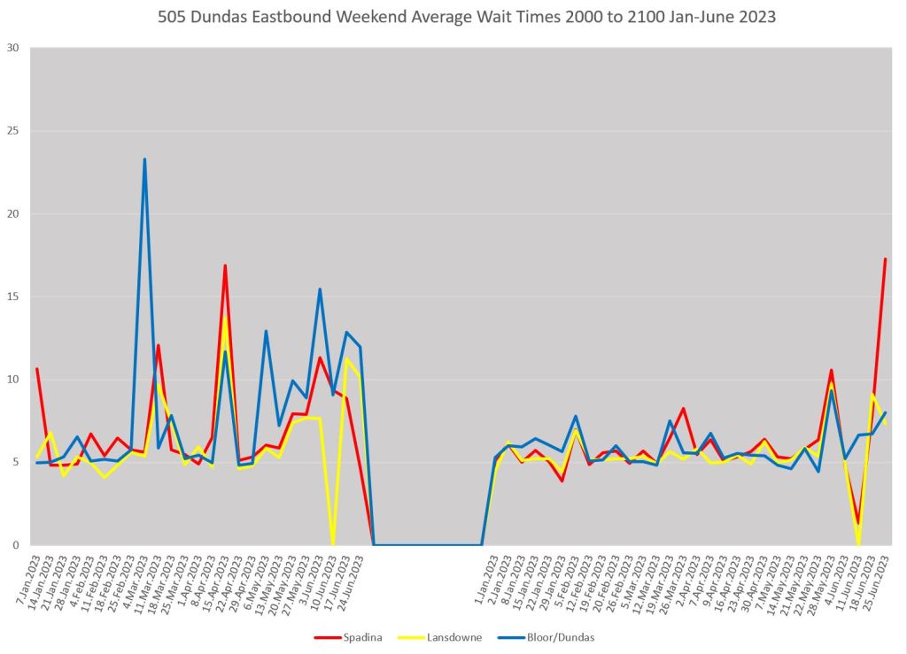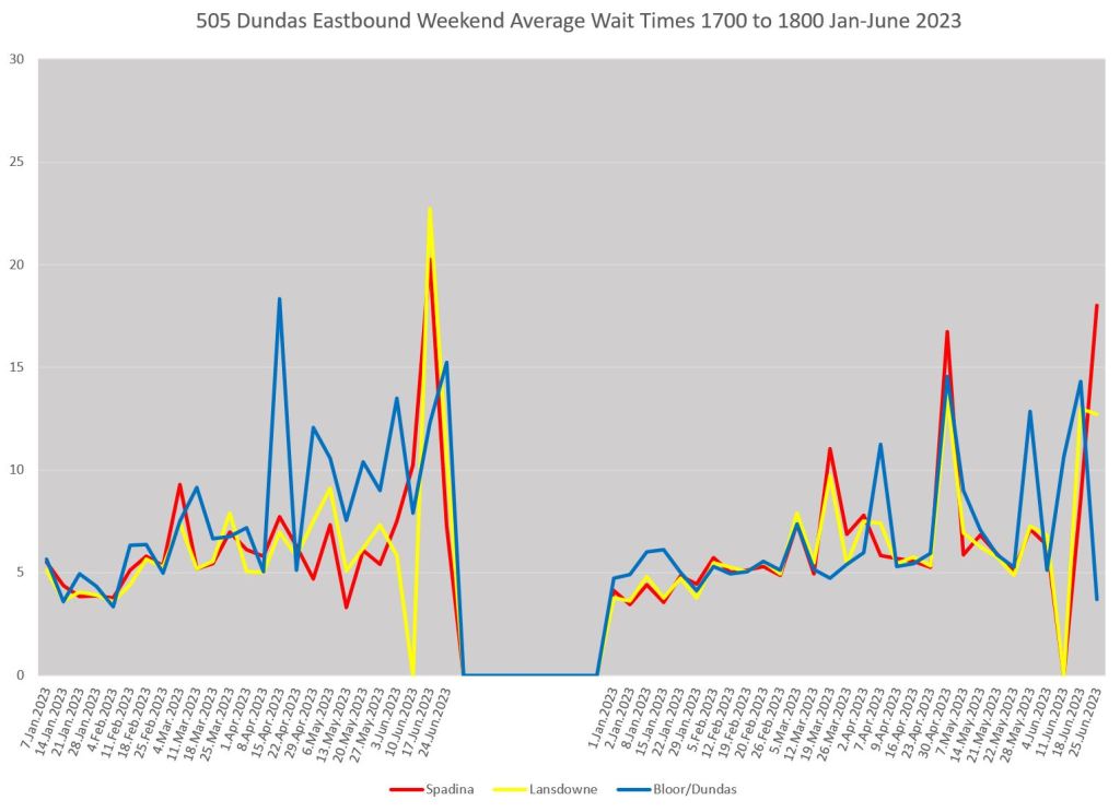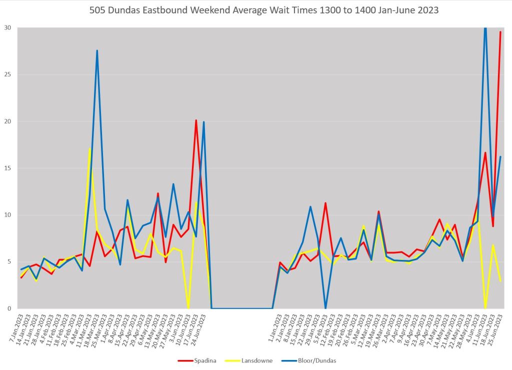 In the charts below, the average wait time at Dundas West (blue) is higher during some periods than at Lansdowne (yellow) due to short turns just west of Lansdowne via College Loop. The PM peak was a difficult time for 505 Dundas even before the Bingham extension as were some weekend periods notably on Saturdays. However, changes after May 7 are visible showing how service was affected on the far end of the route from the diversion.