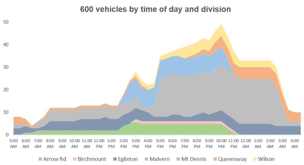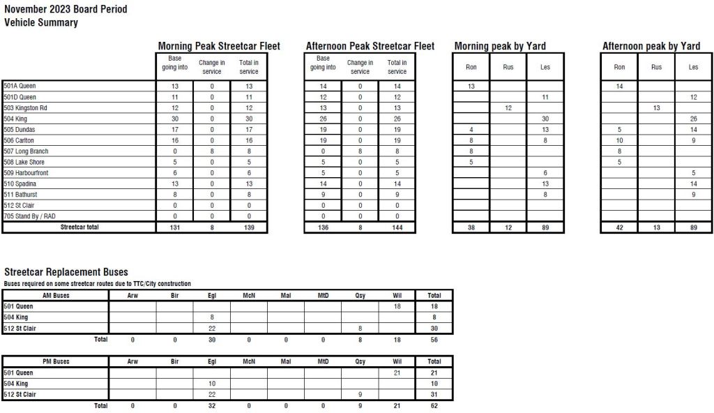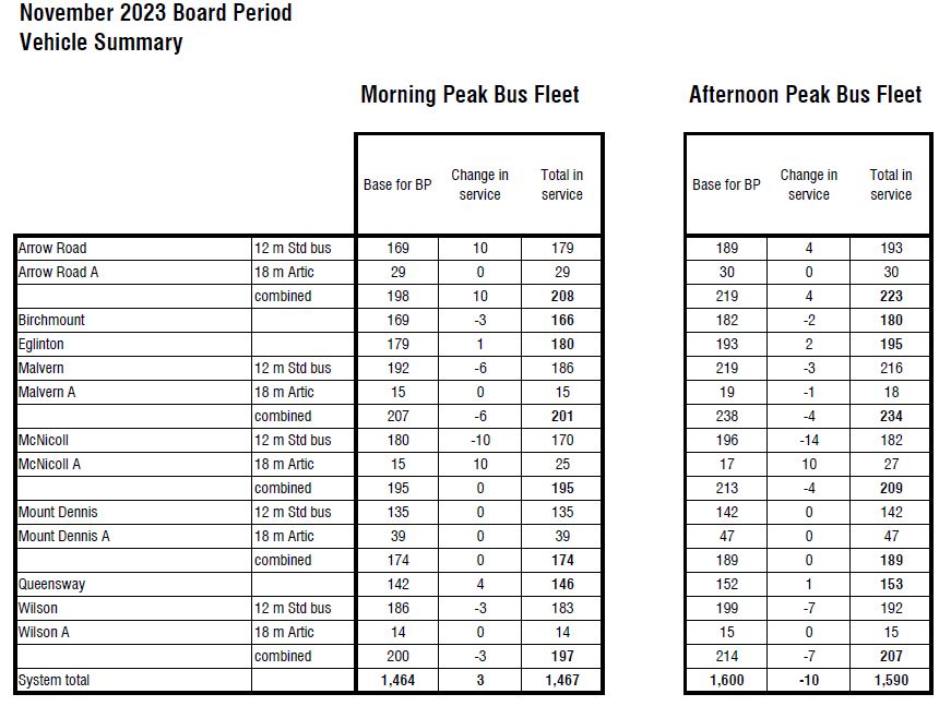 Note that the 2020 data below are the planned levels, while the total cited above is the actual value. The streetcar numbers look odd. The peak streetcar count in 2020 was over 160, but it now sits around 140. I will chase this discrepancy with the TTC.