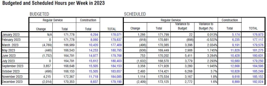 Steve: I plan to update the table I published some time ago comparing pre-pandemic and current service levels. For the record the actual average weekly service hours in February 2020 was 186,448. In November 2023, the scheduled value is 175,534, or 94% of the pre-pandemic level. That is across all modes.