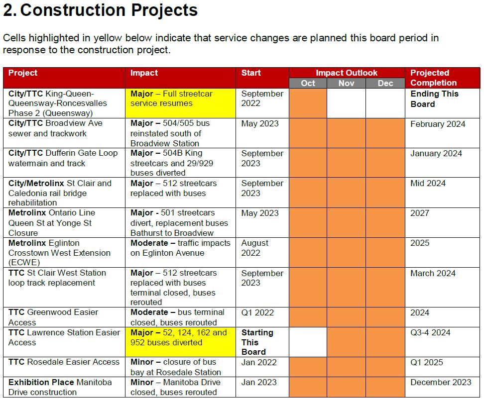 Here is the TTC’s table of construction projects affecting various routes. One point of note here is that construction at St. Clair West Station is expected to end in March 2024, but work at the railway bridge west of Caledonia will run to mid 2024. Whether this implies an early return of streetcar service at least to Earlscourt Loop (Lansdowne) remains to be seen. (I will inquire about this.)