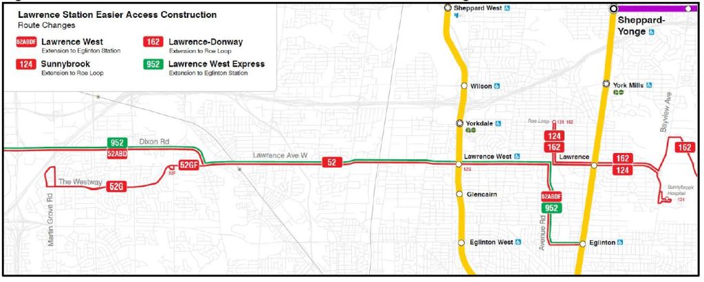 “952 Lawrence West Express buses will not serve Lawrence Station and will end at Eglinton West Station, due to Easier Access construction at Lawrence Station Customers can board a regular 52 Lawrence West bus at the temporary on street stop at Lawrence Avenue and Yonge Street, to travel to Eglinton West Station and transfer to a 952 Lawrence West Express bus at Eglinton West Station.”