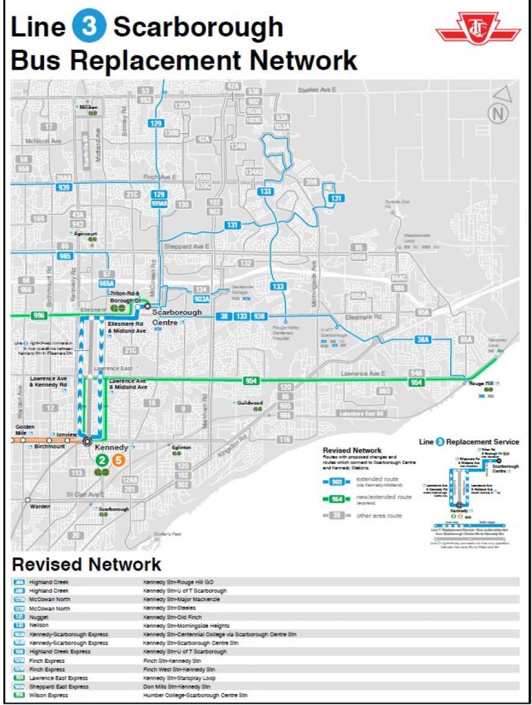 Many routes that now terminate at Scarborough Centre Station will be extended to Kennedy Station. Other concurrent changes are noted below.
