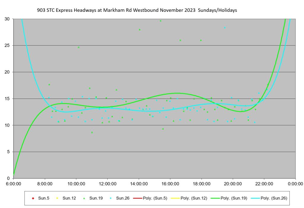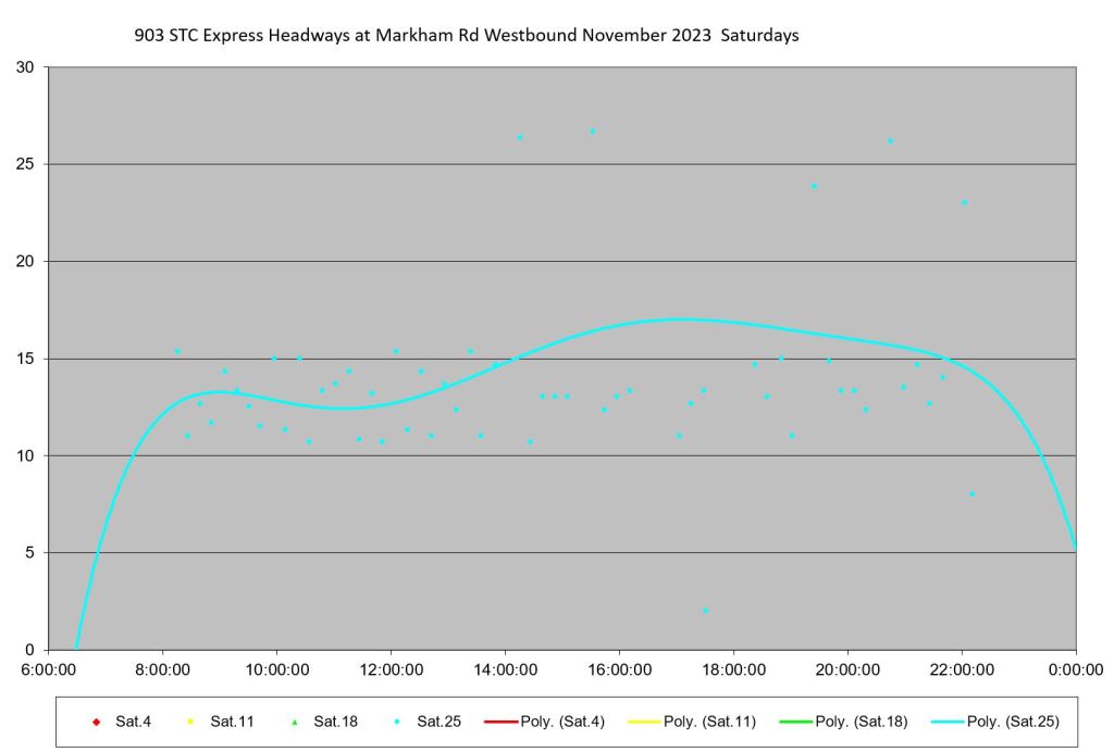 After November 19, the 903 STC Express became more typical of other routes with less frequent service. Variations show up that are similar to other parts of the system. The charts below show headways westbound at Progress and Markham Road, and northbound from Eglinton and Kennedy for the last two weeks of November. The scatter of data points shows the type of service that someone waiting for a 903 bus would experience.