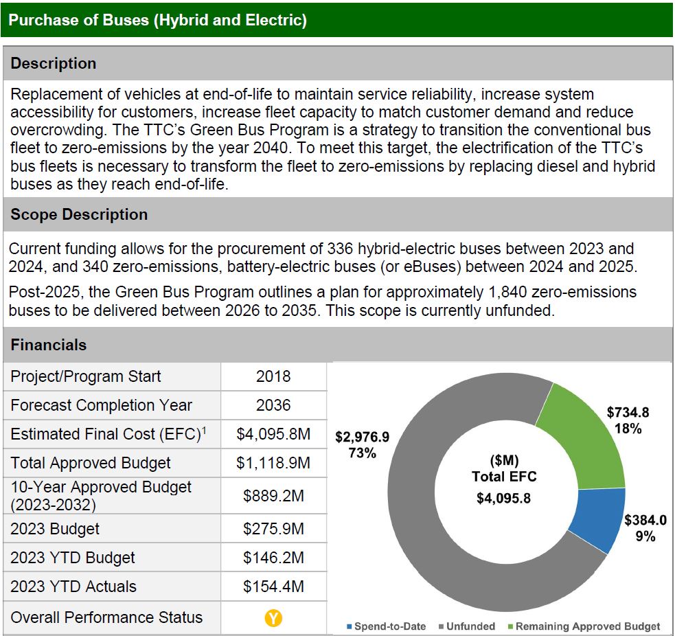 All of those buses and infrastructure are among many large-scale projects overhanging TTC budget planning. According to the December 2023 Major Projects Update, 73% or almost $3 billion for this project is unfunded through to 2036 when the fleet would be all-electric. A further $560 million is unfunded for charging systems.