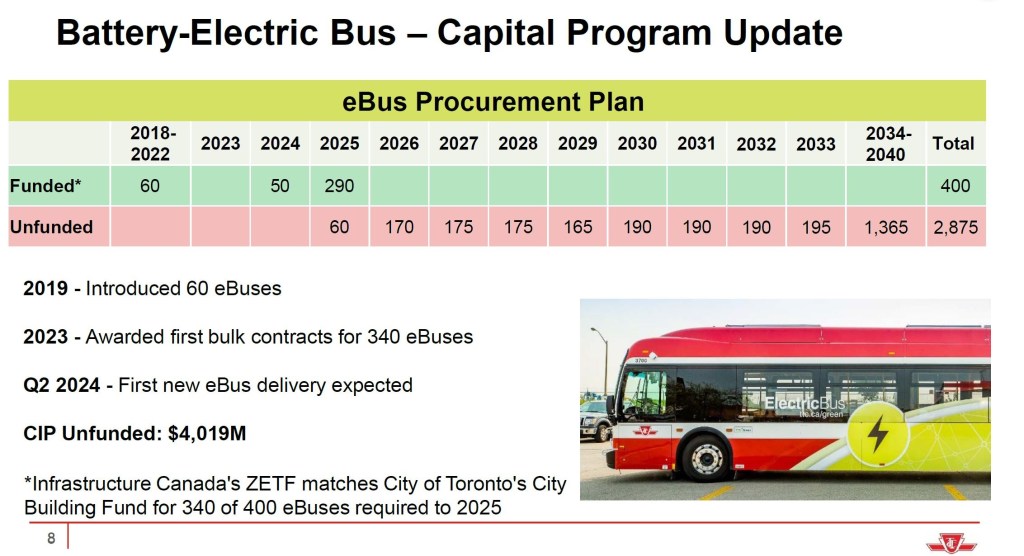 TTC also has a large order for Battery-electric buses (BEBs). The bulk of the order will be delivered from two vendors (New Flyer and NovaBus) in 2025. Where the challenge lies is that the bus procurement program is not funded beyond that point.