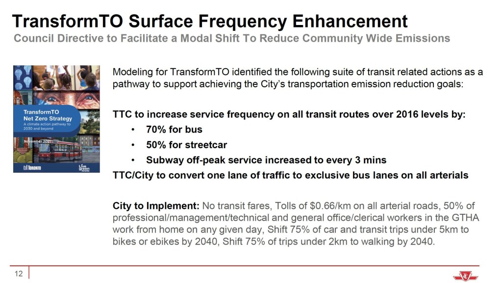 The TransformTO has two levels of targets, of which Council has approved only the first. If there is to be a substantial reduction in emissions and energy demand generally, it is not enough to simply replace diesel buses with electrics, but trips must be diverted to transit. This is a big challenge especially for trips that are not downtown-oriented or lie along rapid transit corridors.